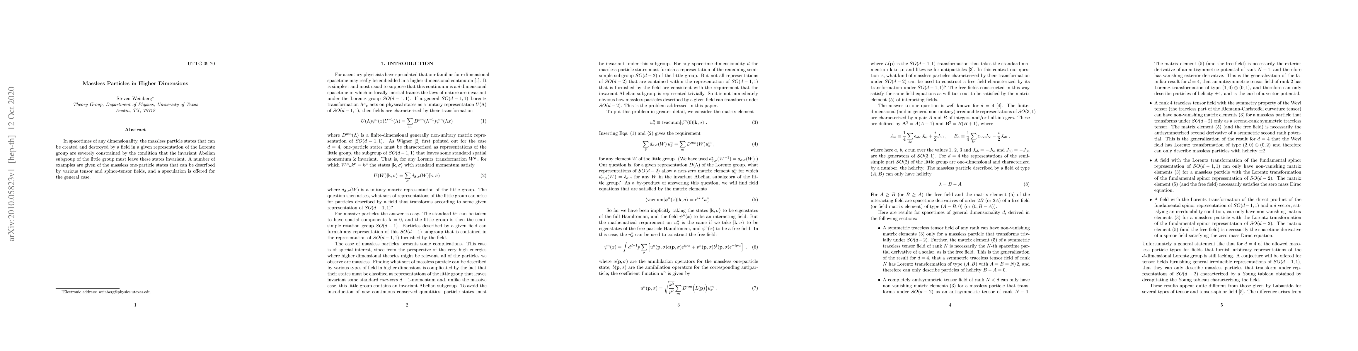 Research shows that massless particles in higher dimensions have limited possibilities due to constraints from invariant Abelian subgroups of the little group. This constrains the types of fields that can describe their behavior.