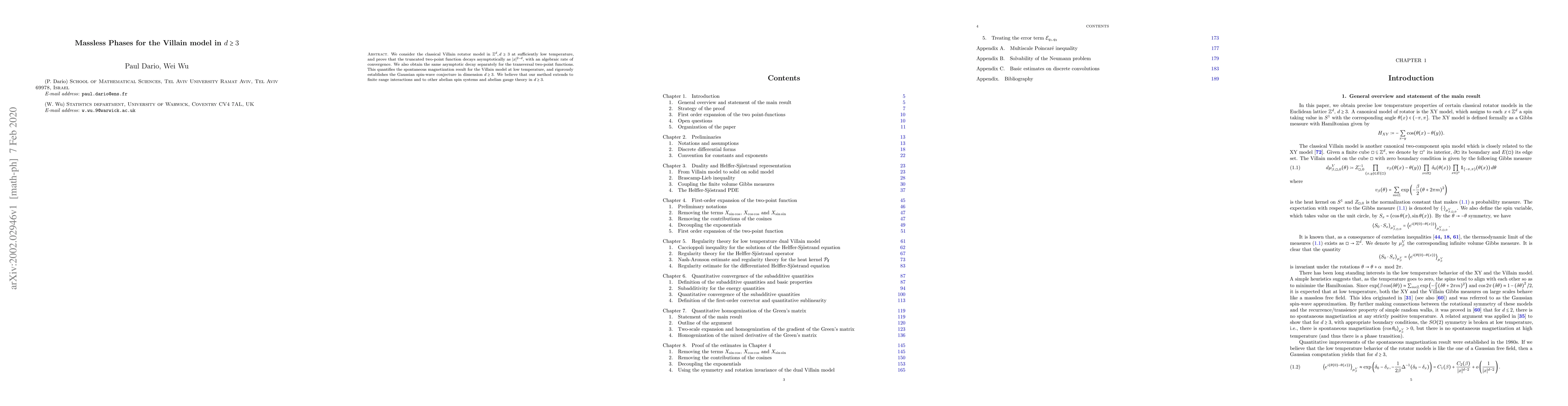 The paper introduces a detailed proof of the asymptotic behavior of the two-point functions for the Villain model, extending previous work to higher dimensions and providing a rigorous verification of the Gaussian spin-wave conjecture.