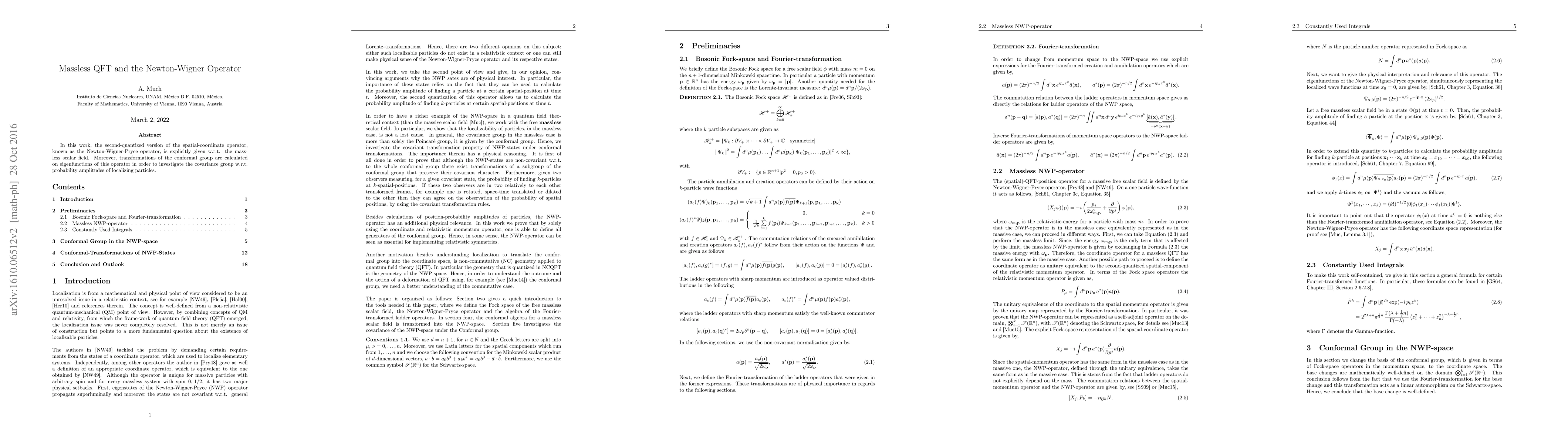 In this work, the second-quantized version of the spatial-coordinate operator, known as the Newton-Wigner-Pryce operator, is explicitly given w.r.t. the massless scalar field. Moreover, transformations of the conformal group are calculated on eigenfunctions of this operator in order to investigate the covariance group w.r.t. probability amplitudes of localizing particles.