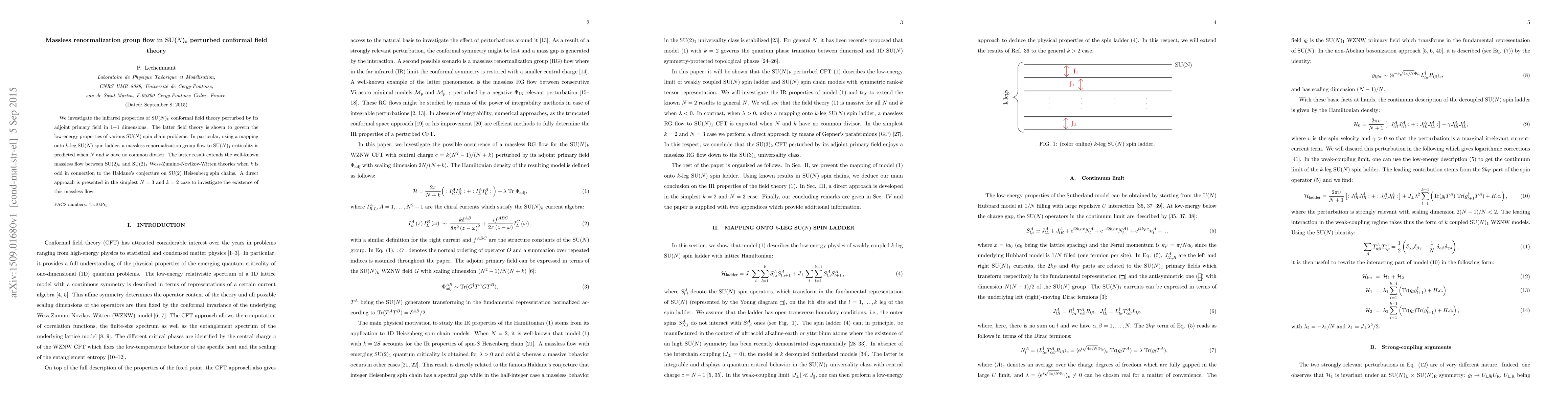 We investigate the infrared properties of SU(N)$_k$ conformal field theory perturbed by its adjoint primary field in 1+1 dimensions. The latter field theory is shown to govern the low-energy properties of various SU(N) spin chain problems. In particular, using a mapping onto k-leg SU(N) spin ladder, a massless renormalization group flow to SU(N)$_1$ criticality is predicted when N and k have no common divisor. The latter result extends the well-known massless flow between SU(2)$_k$ and SU(2)$_1$ Wess-Zumino-Novikov-Witten theories when k is odd in connection to the Haldane's conjecture on SU(2) Heisenberg spin chains. A direct approach is presented in the simplest N=3 and k=2 case to investigate the existence of this massless flow.