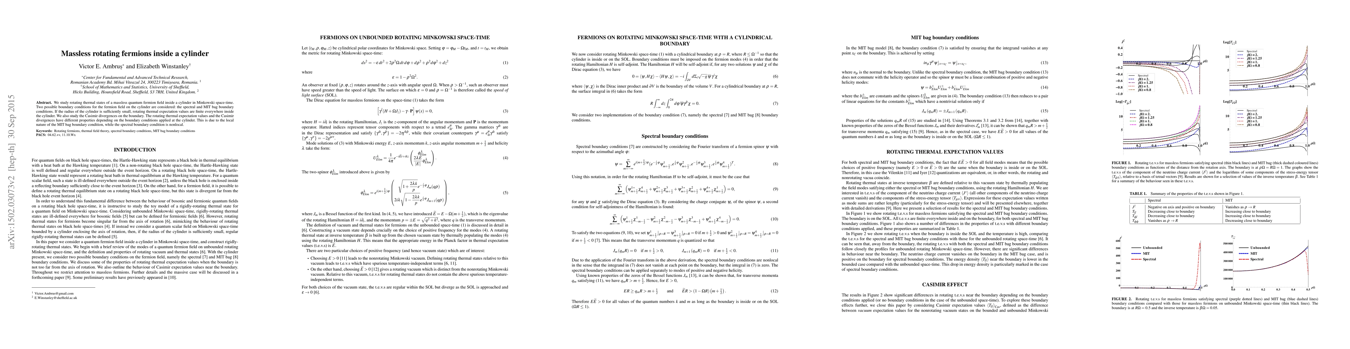 This paper investigates the thermal states of massless fermions rotating within a cylindrical Minkowski space-time, comparing spectral and MIT bag boundary conditions. It finds that finite rotating thermal expectation values exist for sufficiently small cylinder radii, with distinct properties and Casimir divergences depending on the applied boundary conditions.