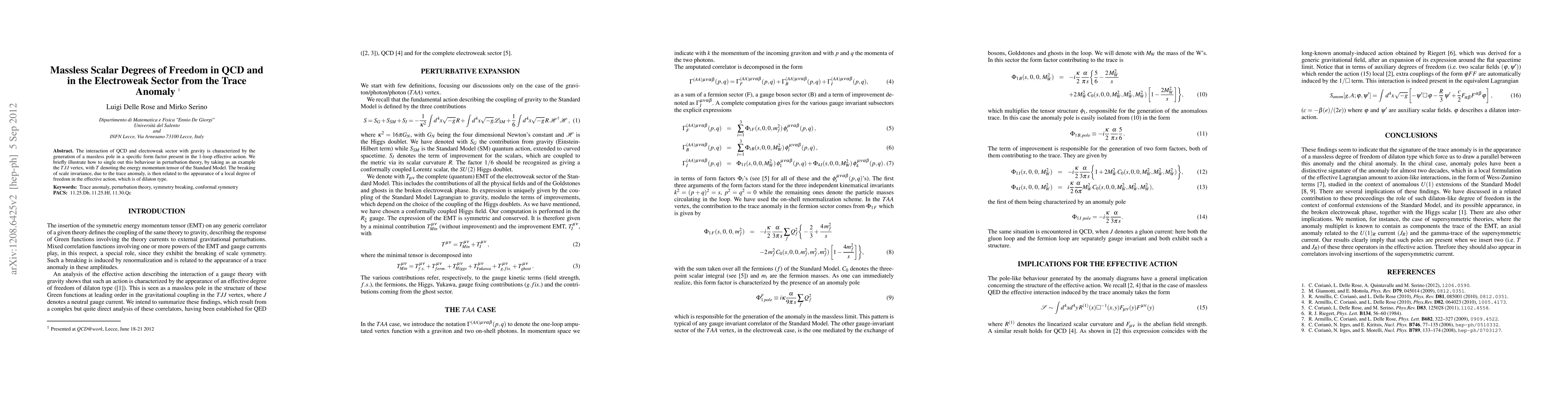 This paper investigates the massless scalar degrees of freedom in Quantum Chromodynamics (QCD) and the electroweak sector via the trace anomaly, showing how a massless pole emerges in a specific form factor in the 1-loop effective action. The study highlights the connection between scale invariance breaking and the appearance of a dilaton-type local degree of freedom.