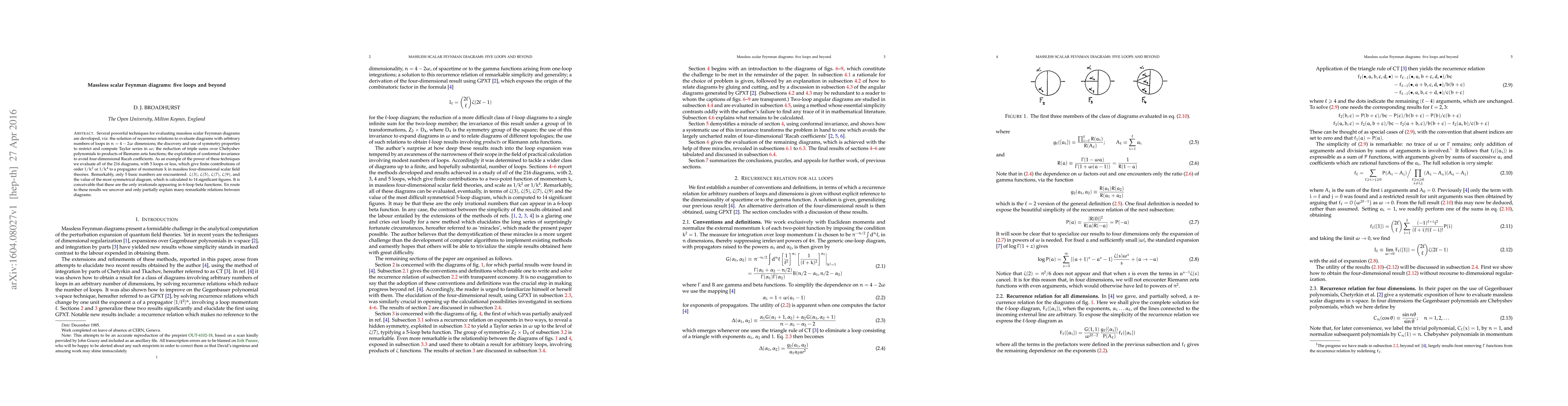 This paper develops advanced techniques for evaluating massless scalar Feynman diagrams, including recurrence relations, symmetry properties, and conformal invariance. It computes all 216 diagrams with five loops or fewer, revealing only five fundamental numbers: $\zeta(3)$, $\zeta(5)$, $\zeta(7)$, $\zeta(9)$, and a highly symmetrical diagram calculated to 14 significant figures.
