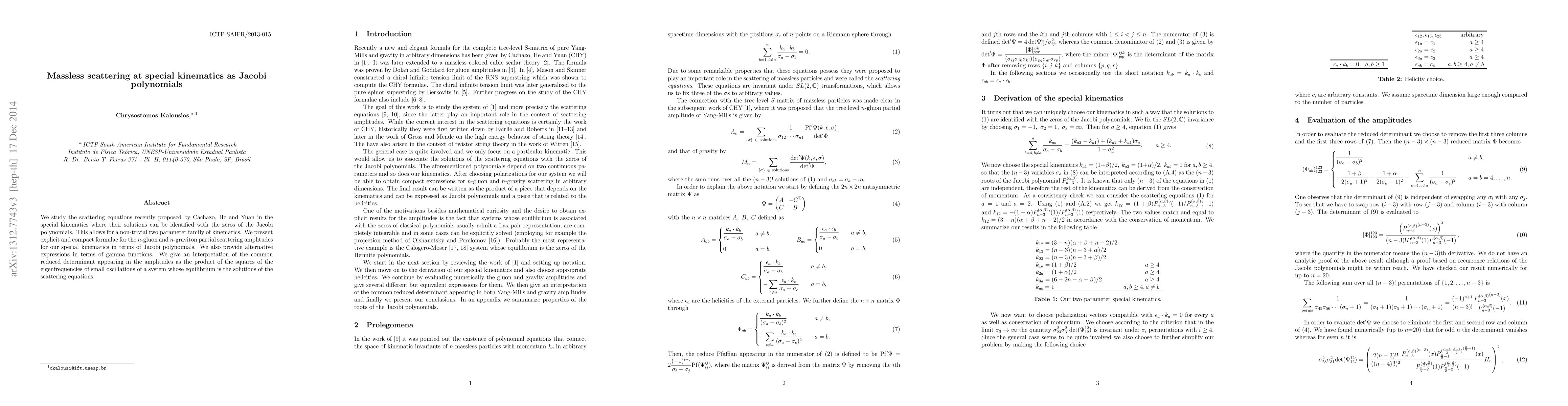 We study the scattering equations recently proposed by Cachazo, He and Yuan in the special kinematics where their solutions can be identified with the zeros of the Jacobi polynomials. This allows for a non-trivial two parameter family of kinematics. We present explicit and compact formulae for the n-gluon and n-graviton partial scattering amplitudes for our special kinematics in terms of Jacobi polynomials. We also provide alternative expressions in terms of gamma functions. We give an interpretation of the common reduced determinant appearing in the amplitudes as the product of the squares of the eigenfrequencies of small oscillations of a system whose equilibrium is the solutions of the scattering equations.