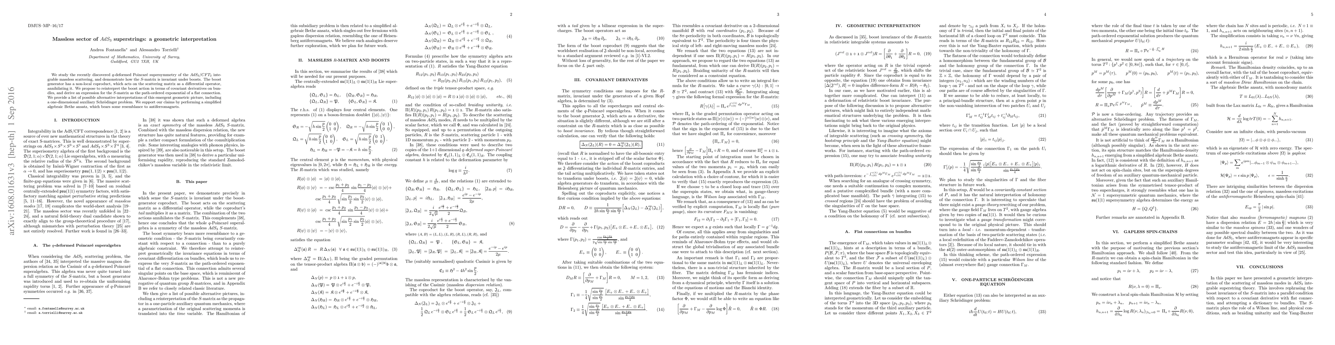 We study the recently discovered q-deformed Poincare' supersymmetry of the AdS_3/CFT_2 integrable massless scattering, and demonstrate how the S-matrix is invariant under boosts. The boost generator has a non-local coproduct, which acts on the scattering matrix as a differential operator, annihilating it. We propose to reinterpret the boost action in terms of covariant derivatives on bundles, and derive an expression for the S-matrix as the path-ordered exponential of a flat connection. We provide a list of possible alternative interpretations of this emergent geometric picture, including a one-dimensional auxiliary Schroedinger problem. We support our claims by performing a simplified algebraic Bethe ansatz, which bears some resemblance to antiferromagnets.