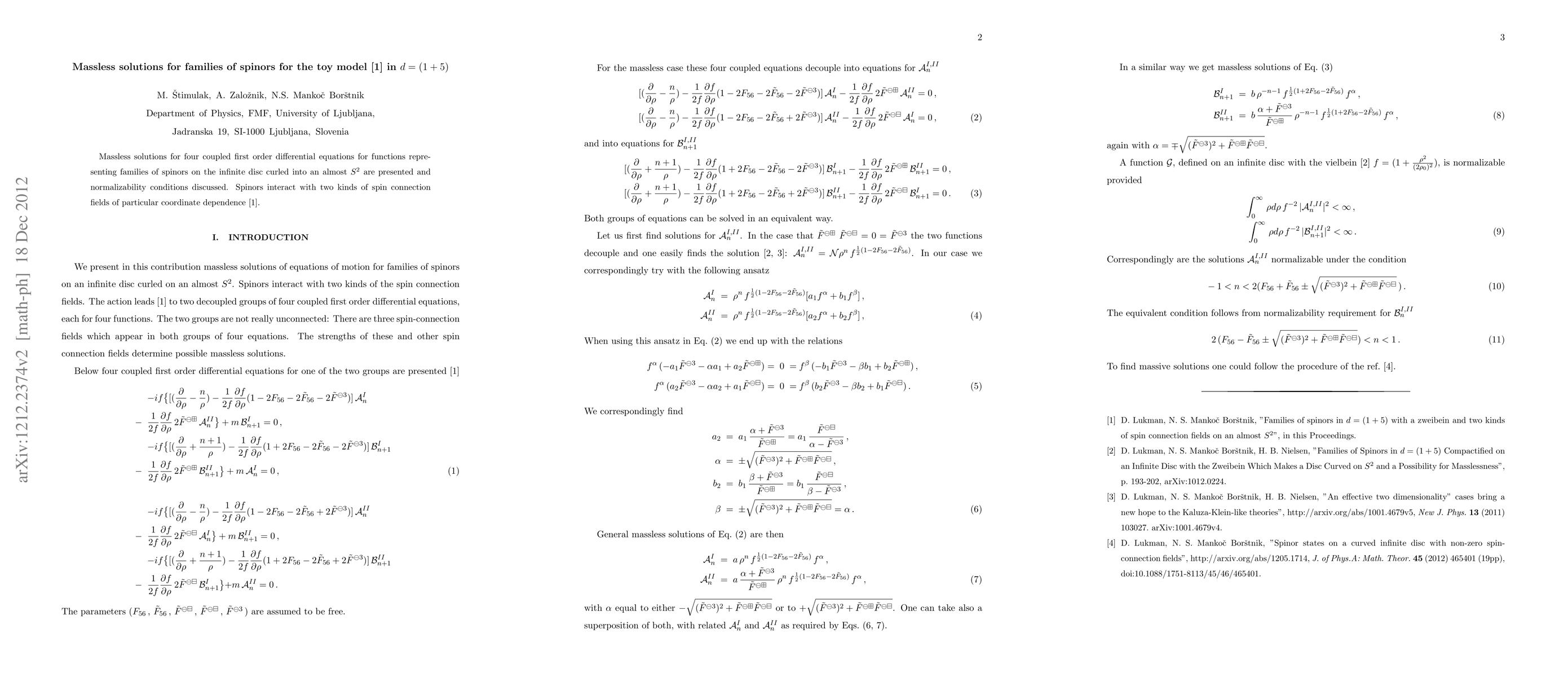 Massless solutions for four coupled first order differential equations for functions representing families of spinors on the infinite disc curled into an almost $S^2$ are presented and normalizability conditions discussed. Spinors interact with two kinds of spin connection fields of particular coordinate dependence. This is the solution of equations of motion used in "Families of spinors in $d=(1+5)$ with zweibein and two kinds of spin connection fields on an almost $S^2$".