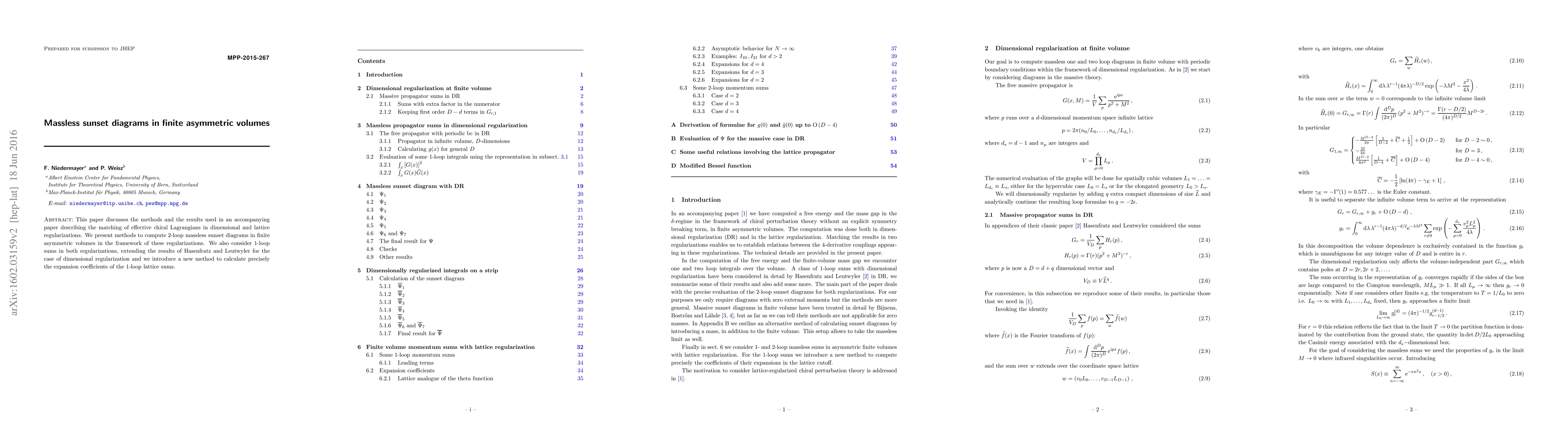 This paper discusses the methods and the results used in an accompanying paper describing the matching of effective chiral Lagrangians in dimensional and lattice regularizations. We present methods to compute 2-loop massless sunset diagrams in finite asymmetric volumes in the framework of these regularizations. We also consider 1-loop sums in both regularizations, extending the results of Hasenfratz and Leutwyler for the case of dimensional regularization and we introduce a new method to calculate precisely the expansion coefficients of the 1-loop lattice sums.