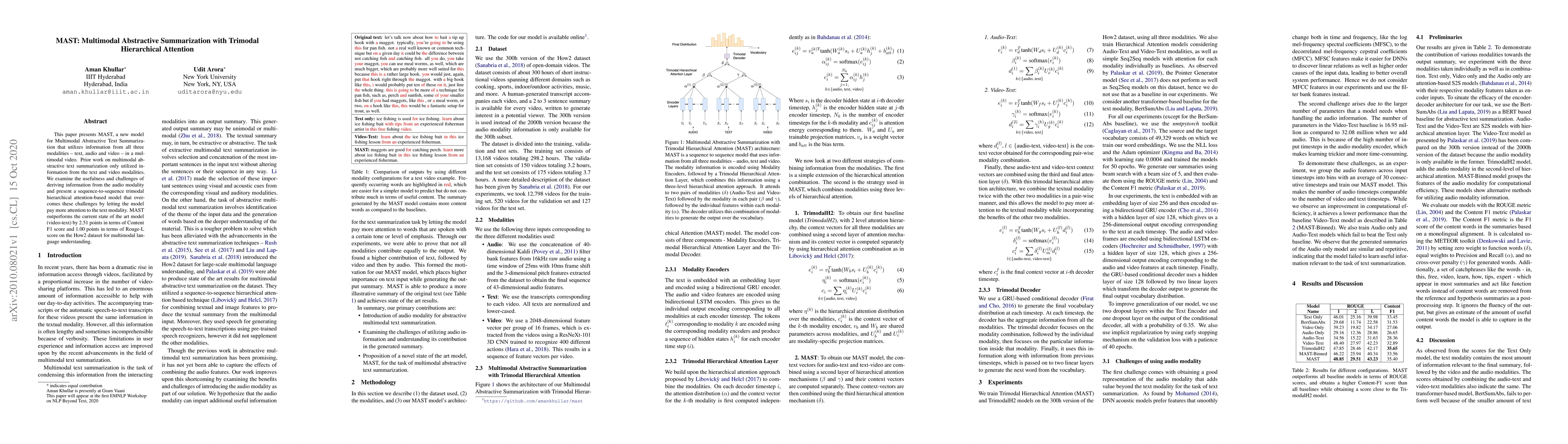 MAST is a novel model for multimodal abstractive text summarization integrating text, audio, and video modalities. It employs a sequence-to-sequence trimodal hierarchical attention mechanism to enhance summarization quality, outperforming existing text-video models by 2.51 points in Content F1 score and 1.00 points in Rouge-L score on the How2 dataset.