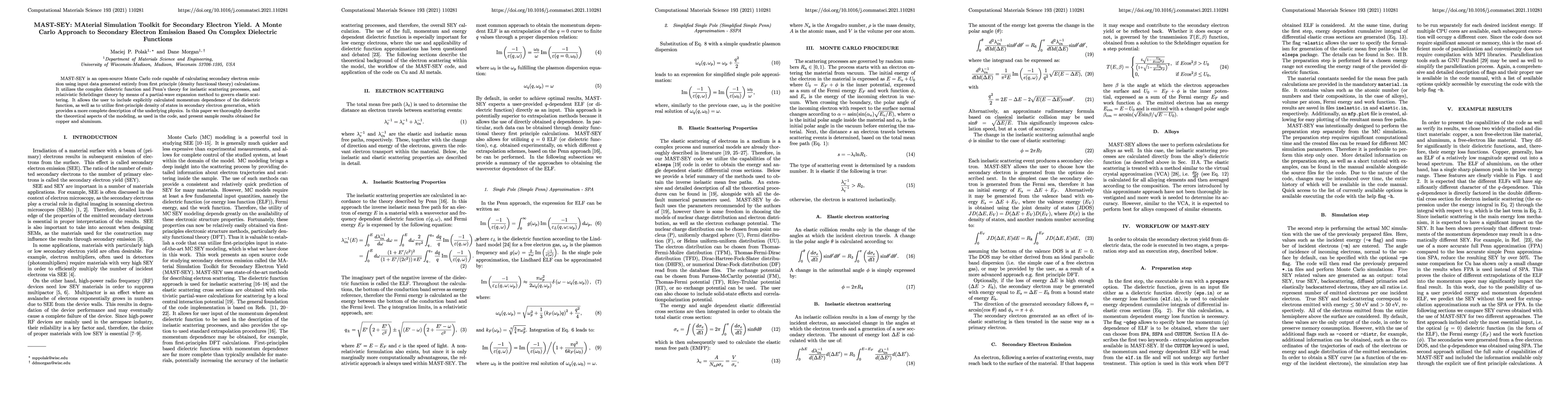 MAST-SEY is an open-source Monte Carlo code for calculating secondary electron emission based on first-principle calculations. It employs complex dielectric functions and relativistic Schrödinger theory to model inelastic and elastic scattering processes, providing a comprehensive physical description.