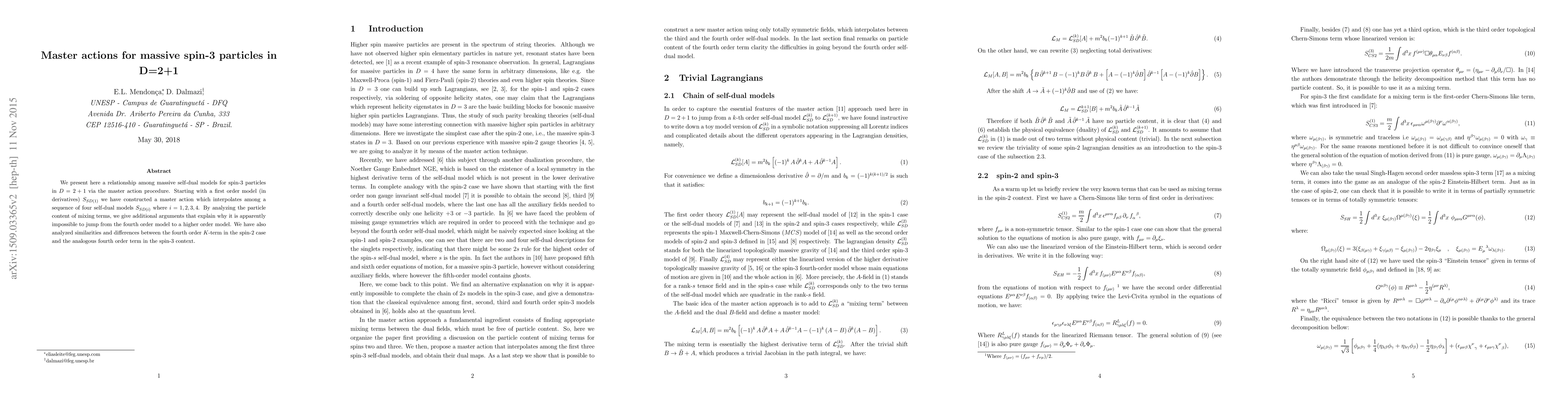 This paper constructs a master action for massive spin-3 particles in 2+1 dimensions, interpolating among four self-dual models. It argues that transitioning from the fourth-order model to a higher-order model is impossible due to the mixing terms' particle content.