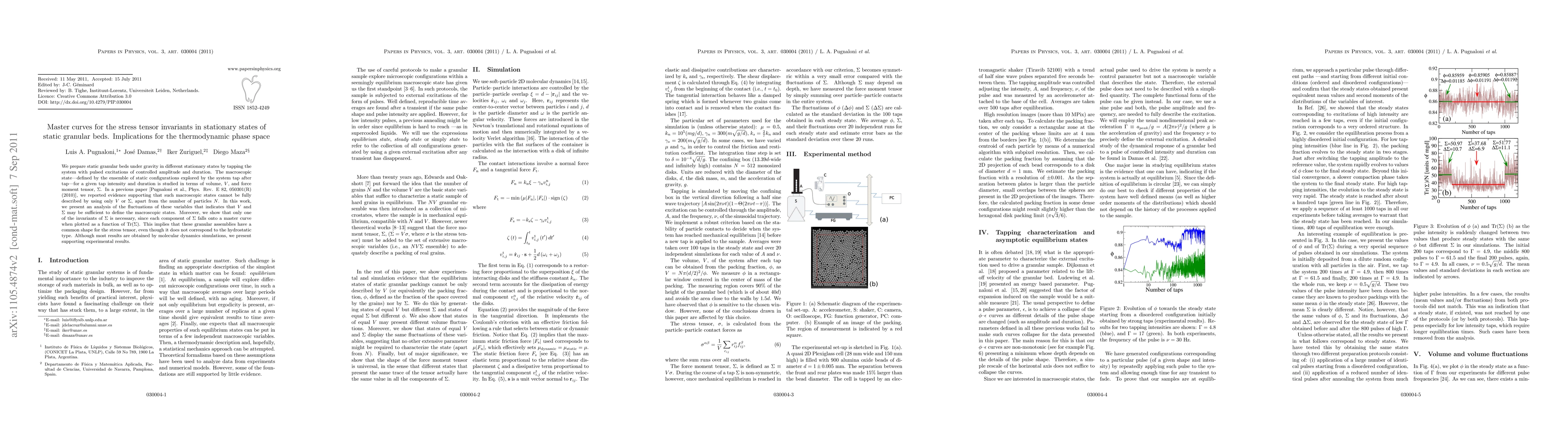 We prepare static granular beds under gravity in different stationary states by tapping the system with pulsed excitations of controlled amplitude and duration. The macroscopic state---defined by the ensemble of static configurations explored by the system tap after tap---for a given tap intensity and duration is studied in terms of volume, V, and force moment tensor, \Sigma. In a previous paper [Pugnaloni et al., Phys. Rev. E 82, 050301(R) (2010)], we reported evidence supporting that such macroscopic states cannot be fully described by using only V or \Sigma, apart from the number of particles N. In this work, we present an analysis of the fluctuations of these variables that indicates that V and \Sigma may be sufficient to define the macroscopic states. Moreover, we show that only one of the invariants of \Sigma is necessary, since each component of \Sigma falls onto a master curve when plotted as a function of Tr(\Sigma). This implies that these granular assemblies have a common shape for the stress tensor, even though it does not correspond to the hydrostatic type. Although most results are obtained by molecular dynamics simulations, we present supporting experimental results.