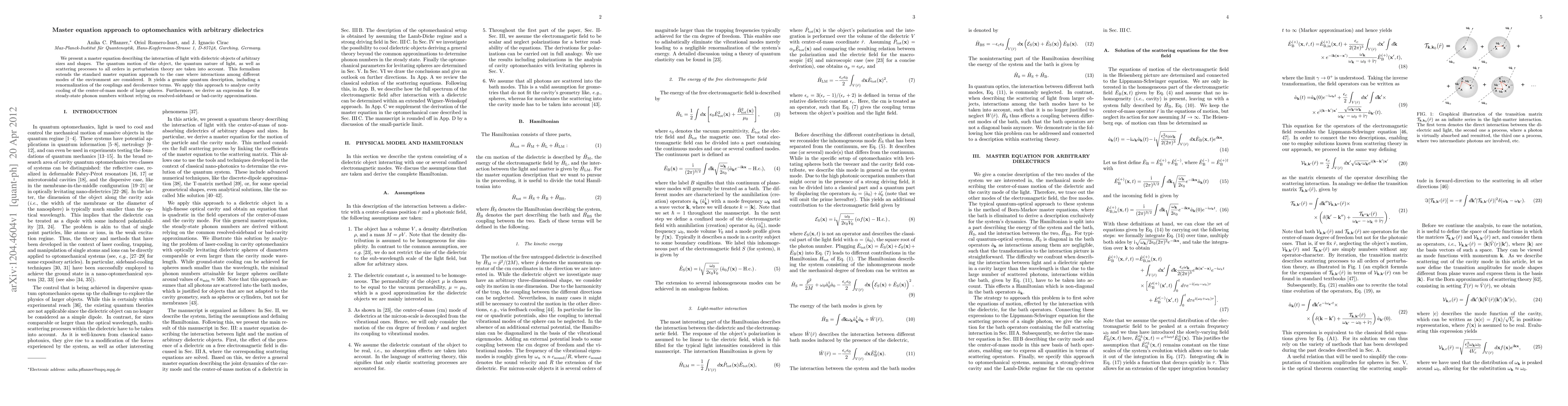 We present a master equation describing the interaction of light with dielectric objects of arbitrary sizes and shapes. The quantum motion of the object, the quantum nature of light, as well as scattering processes to all orders in perturbation theory are taken into account. This formalism extends the standard master equation approach to the case where interactions among different modes of the environment are considered. It yields a genuine quantum description, including a renormalization of the couplings and decoherence terms. We apply this approach to analyze cavity cooling of the center-of-mass mode of large spheres. Furthermore, we derive an expression for the steady-state phonon numbers without relying on resolved-sideband or bad-cavity approximations.