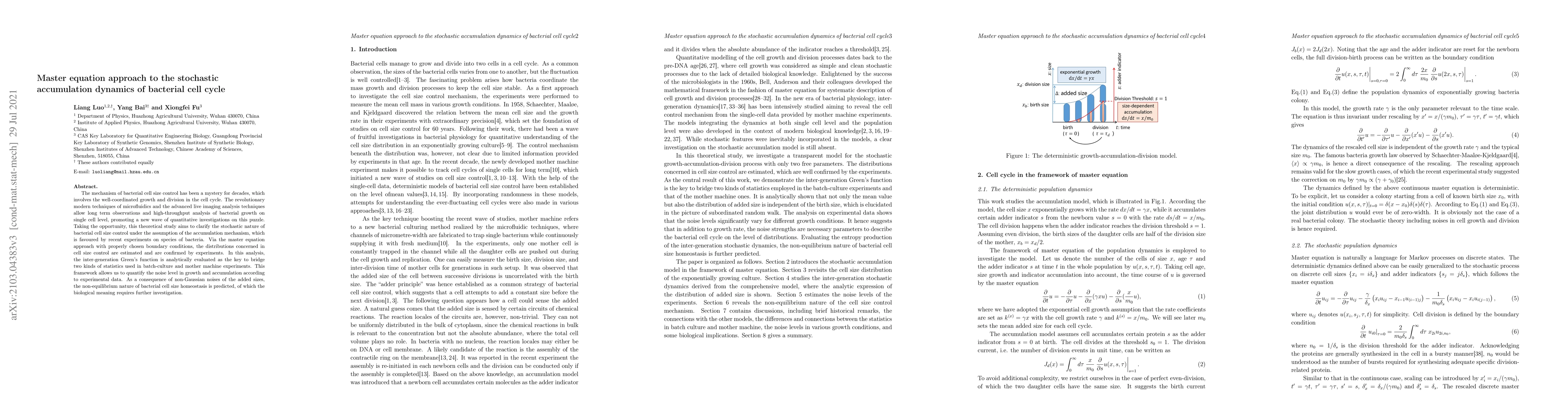 This paper uses a master equation approach to investigate the stochastic dynamics of bacterial cell cycle accumulation, revealing non-Gaussian noise and predicting a non-equilibrium nature of bacterial cell size homeostasis, which is supported by experimental data and advanced imaging techniques.