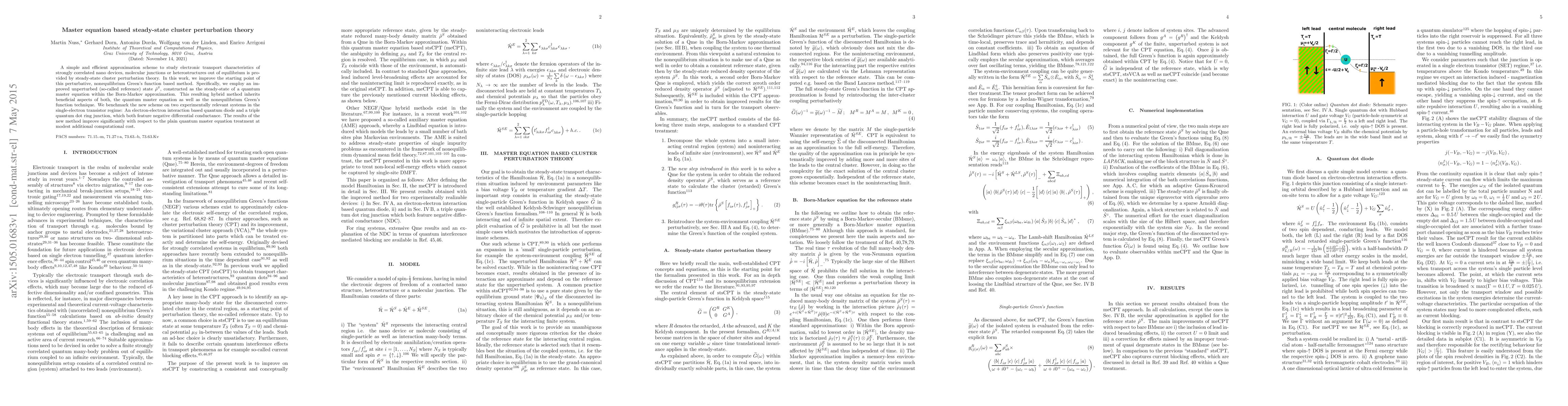 A simple and efficient approximation scheme to study electronic transport characteristics of strongly correlated nano devices, molecular junctions or heterostructures out of equilibrium is provided by steady-state cluster perturbation theory. In this work, we improve the starting point of this perturbative, nonequilibrium Green's function based method. Specifically, we employ an improved unperturbed (so-called reference) state $\hat{\rho}^S$, constructed as the steady-state of a quantum master equation within the Born-Markov approximation. This resulting hybrid method inherits beneficial aspects of both, the quantum master equation as well as the nonequilibrium Green's function technique. We benchmark the new scheme on two experimentally relevant systems in the single-electron transistor regime: An electron-electron interaction based quantum diode and a triple quantum dot ring junction, which both feature negative differential conductance. The results of the new method improve significantly with respect to the plain quantum maste equation treatment at modest additional computational cost.