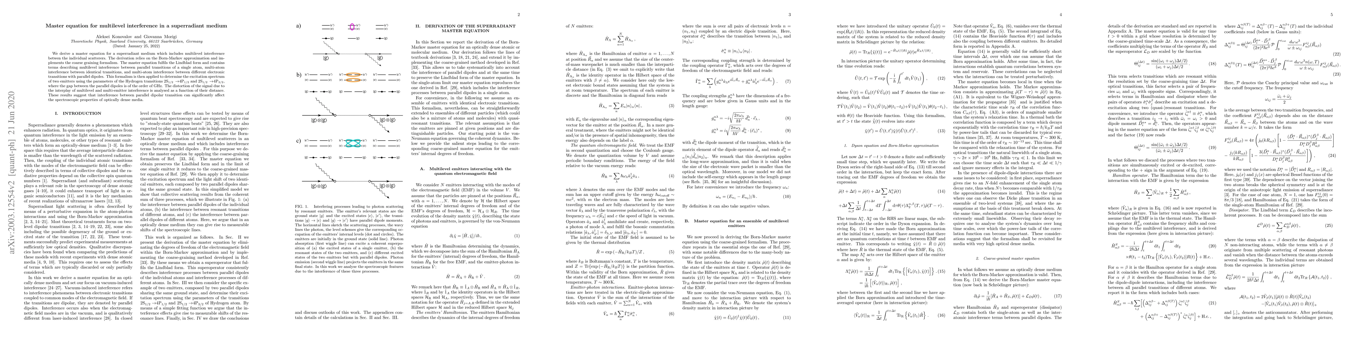 We derive a master equation for a superradiant medium which includes multilevel interference betwen the individual scatterers. The derivation relies on the Born-Markov approximation and implements the coarse graining formalism. The master equation fulfils the Lindblad form and contains terms describing single-atom multilevel interference, multi-atom interference between identical transitions, and multi-atom interference between different electronic transitions with parallel dipoles. This formalism is then applied to determine the excitation spectrum of two emitters using the parameters of the Hydrogen transitions 2S$_{1/2}\,\to$4P$_{1/2}$ and 2S$_{1/2}\,\to$4P$_{3/2}$, where the gap between the parallel dipoles is of the order of GHz. The distortion of the signal due to the interplay of multilevel and multi-emitter interference is analysed as a function of their distance. These results suggest that interference between parallel dipolar transition can significantly affect the spectroscopic properties of optically dense media.