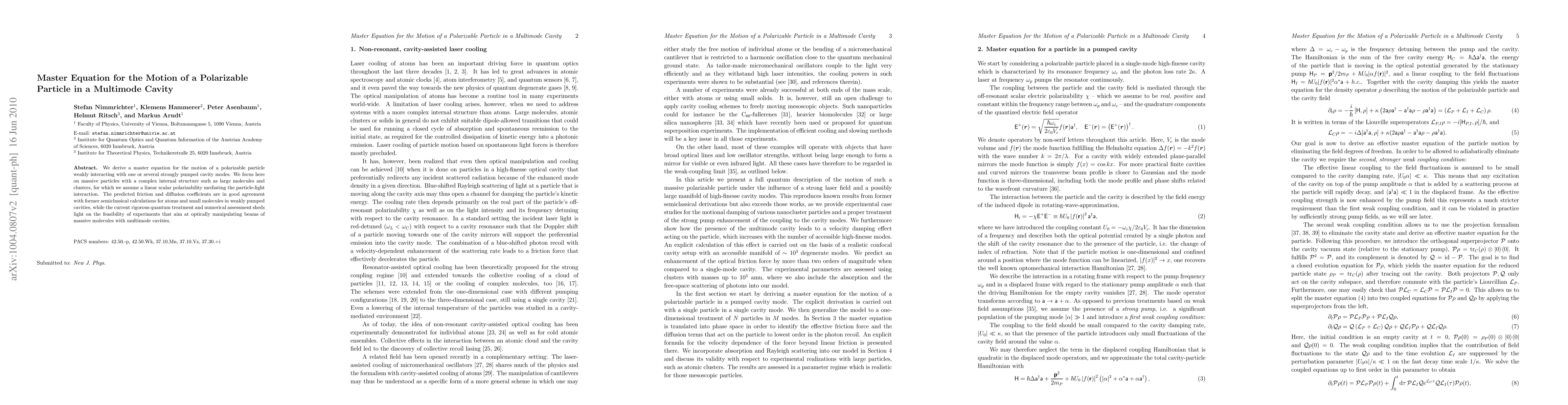 We derive a master equation for the motion of a polarizable particle weakly interacting with one or several strongly pumped cavity modes. We focus here on massive particles with complex internal structure such as large molecules and clusters, for which we assume a linear scalar polarizability mediating the particle-light interaction. The predicted friction and diffusion coefficients are in good agreement with former semiclassical calculations for atoms and small molecules in weakly pumped cavities, while the current rigorous quantum treatment and numerical assessment sheds a light on the feasibility of experiments that aim at optically manipulating beams of massive molecules with multimode cavities.