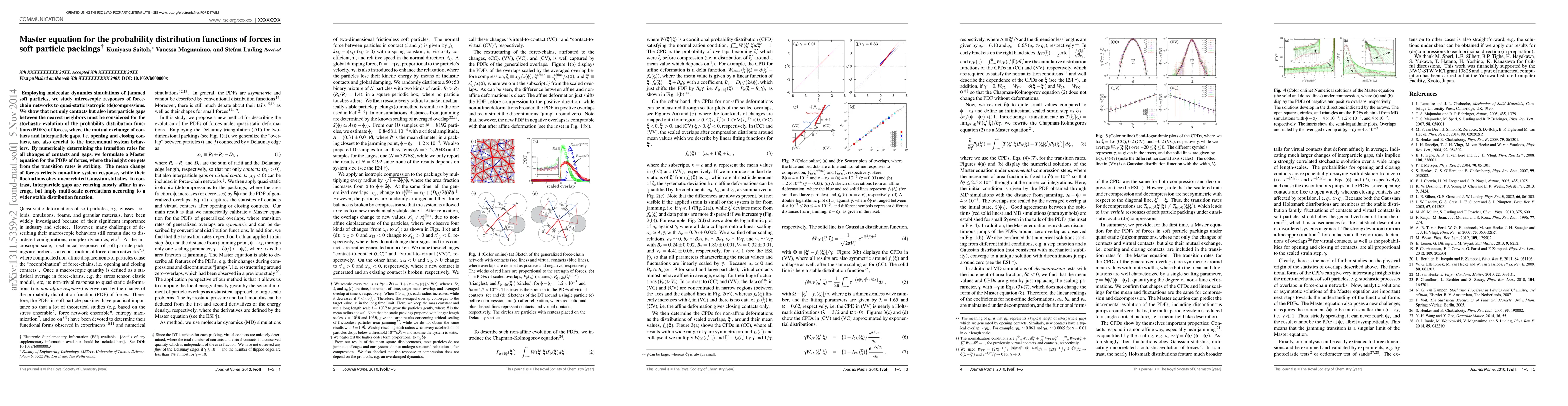 This paper develops a Master equation to describe the probability distribution functions (PDFs) of forces in jammed soft particle packings, using molecular dynamics simulations. It reveals that both contacts and interparticle gaps are essential for understanding the stochastic evolution of force distributions, highlighting non-affine mean force changes and uncorrelated Gaussian fluctuations, while interparticle gaps exhibit multi-scale correlations.