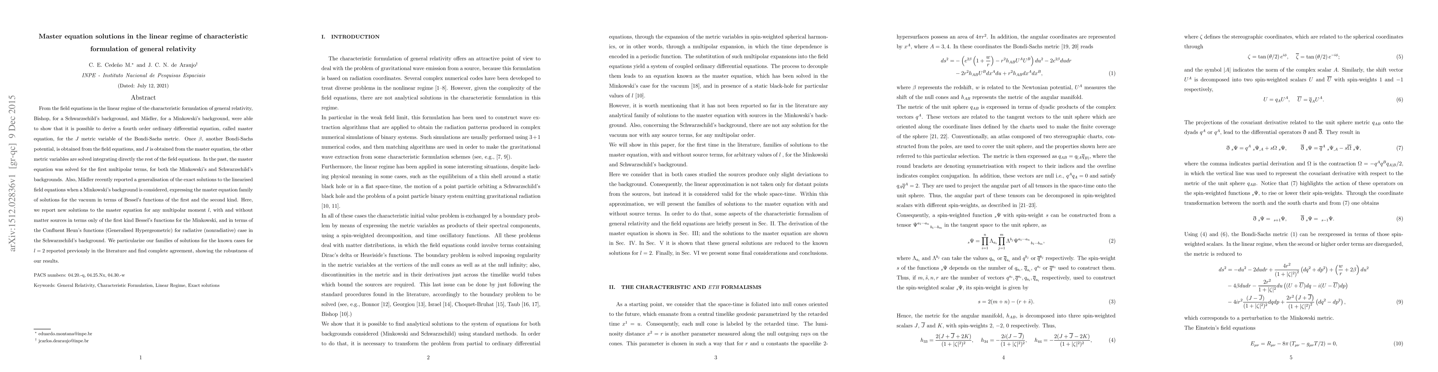 From the field equations in the linear regime of the characteristic formulation of general relativity, Bishop, for a Schwarzschild's background, and M\"adler, for a Minkowski's background, were able to show that it is possible to derive a fourth order ordinary differential equation, called master equation, for the $J$ metric variable of the Bondi-Sachs metric. Once $\beta$, another Bondi-Sachs potential, is obtained from the field equations, and $J$ is obtained from the master equation, the other metric variables are solved integrating directly the rest of the field equations. In the past, the master equation was solved for the first multipolar terms, for both the Minkowski's and Schwarzschild's backgrounds. Also, M\"adler recently reported a generalisation of the exact solutions to the linearised field equations when a Minkowski's background is considered, expressing the master equation family of solutions for the vacuum in terms of Bessel's functions of the first and the second kind. Here, we report new solutions to the master equation for any multipolar moment $l$, with and without matter sources in terms only of the first kind Bessel's functions for the Minkowski, and in terms of the Confluent Heun's functions (Generalised Hypergeometric) for radiative (nonradiative) case in the Schwarzschild's background. We particularize our families of solutions for the known cases for $l=2$ reported previously in the literature and find complete agreement, showing the robustness of our results.