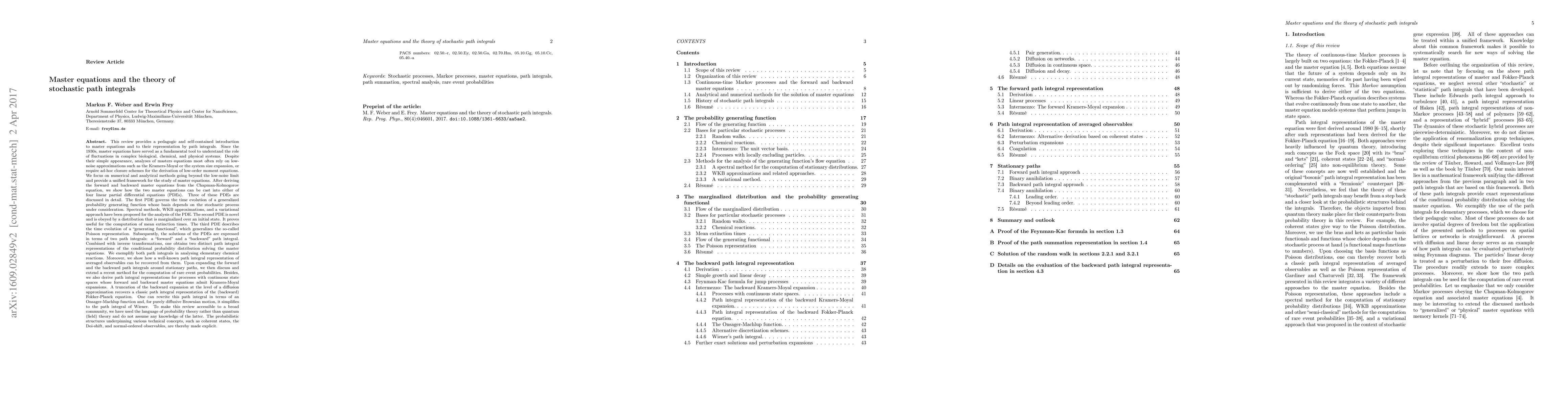 This review provides a pedagogic and self-contained introduction to master equations and to their representation by path integrals. We discuss analytical and numerical methods for the solution of master equations, keeping our focus on methods that are applicable even when stochastic fluctuations are strong. The reviewed methods include the generating function technique and the Poisson representation, as well as novel ways of mapping the forward and backward master equations onto linear partial differential equations (PDEs). Spectral methods, WKB approximations, and a variational approach have been proposed for the analysis of the PDE obeyed by the generating function. After outlining these methods, we solve the derived PDEs in terms of two path integrals. The path integrals provide distinct exact representations of the conditional probability distribution solving the master equations. We exemplify both path integrals in analysing elementary chemical reactions. Furthermore, we review a method for the approximation of rare event probabilities and derive path integral representations of Fokker-Planck equations. To make our review accessible to a broad community, we have used the language of probability theory rather than quantum (field) theory. The probabilistic structures underpinning various technical concepts, such as coherent states, the Doi-shift, and normal-ordered observables, are thereby made explicit.