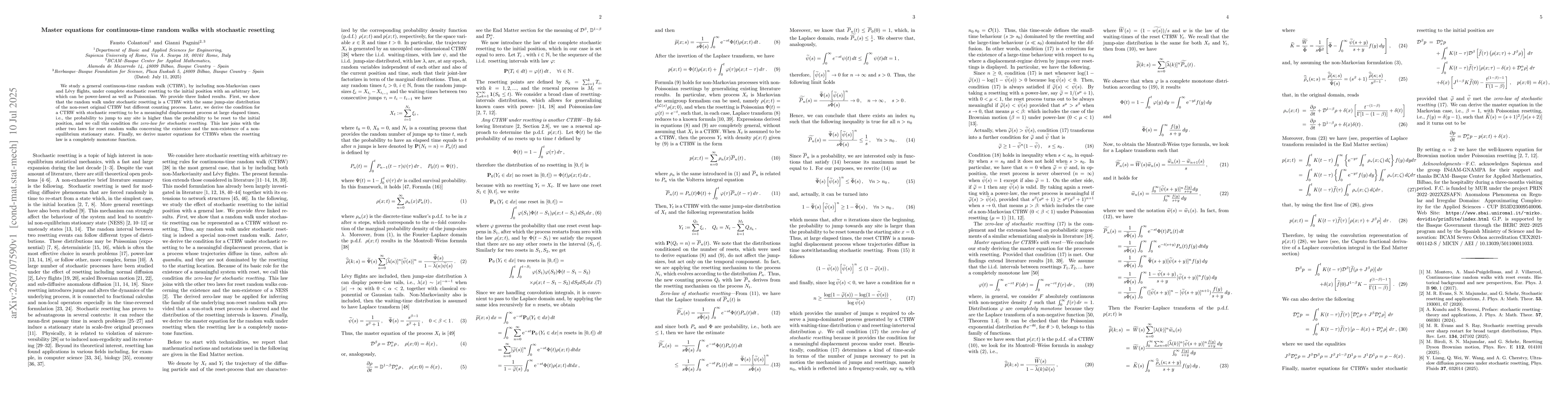 We study a general continuous-time random walk (CTRW), by including non-Markovian cases and L\'evy flights, under complete stochastic resetting to the initial position with an arbitrary law, which can be power-lawed as well as Poissonian. We provide three linked results. First, we show that the random walk under stochastic resetting is a CTRW with the same jump-size distribution of the non-reset original CTRW but different counting process. Later, we derive the condition for a CTRW with stochastic resetting to be a meaningful displacement process at large elapsed times, i.e., the probability to jump to any site is higher than the probability to be reset to the initial position, and we call this condition the zero-law for stochastic resetting. This law joins with the other two laws for reset random walks concerning the existence and the non-existence of a non-equilibrium stationary state. Finally, we derive master equations for CTRWs when the resetting law is a completely monotone function.