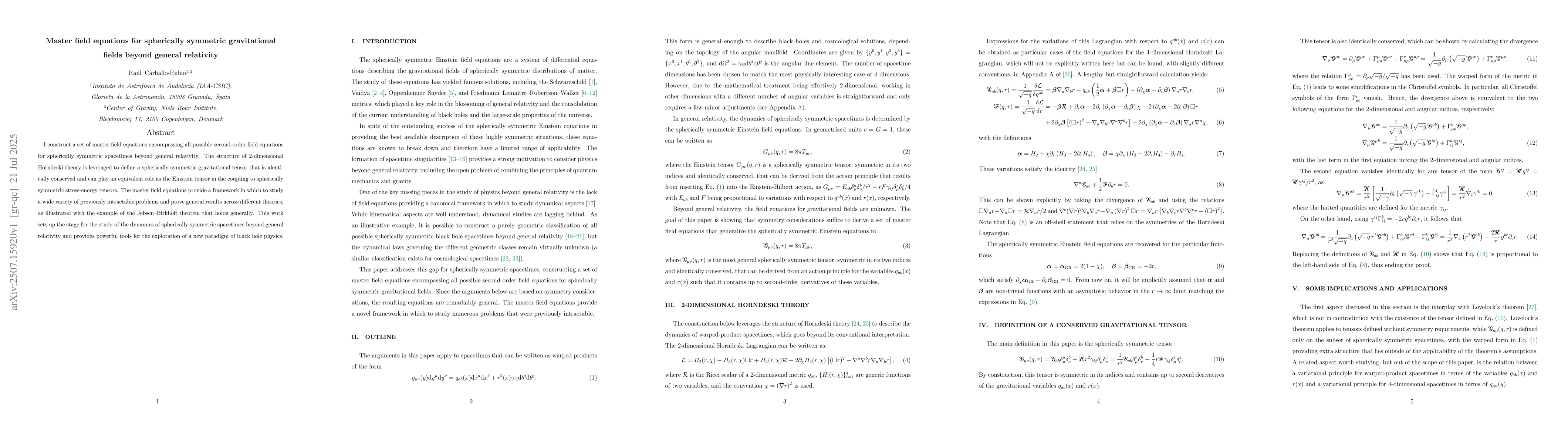I construct a set of master field equations encompassing all possible second-order field equations for spherically symmetric spacetimes beyond general relativity. The structure of 2-dimensional Horndeski theory is leveraged to define a spherically symmetric gravitational tensor that is identically conserved and can play an equivalent role as the Einstein tensor in the coupling to spherically symmetric stress-energy tensors. The master field equations provide a framework in which to study a wide variety of previously intractable problems and prove general results across different theories, as illustrated with the example of the Jebsen--Birkhoff theorem that holds generally. This work sets up the stage for the study of the dynamics of spherically symmetric spacetimes beyond general relativity and provides powerful tools for the exploration of a new paradigm of black hole physics.