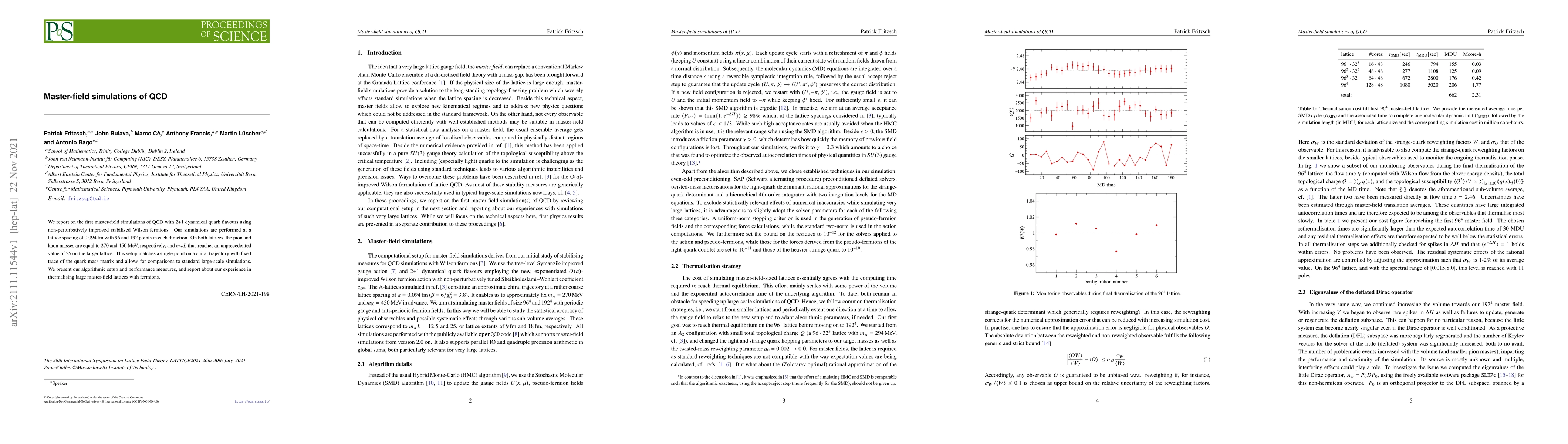 This paper presents the first master-field simulations of QCD with 2+1 dynamical quark flavors using non-perturbatively improved stabilised Wilson fermions. The study achieves unprecedented pion-to-lattice spacing ratios on a larger lattice, providing valuable insights into thermalisation and algorithmic performance.