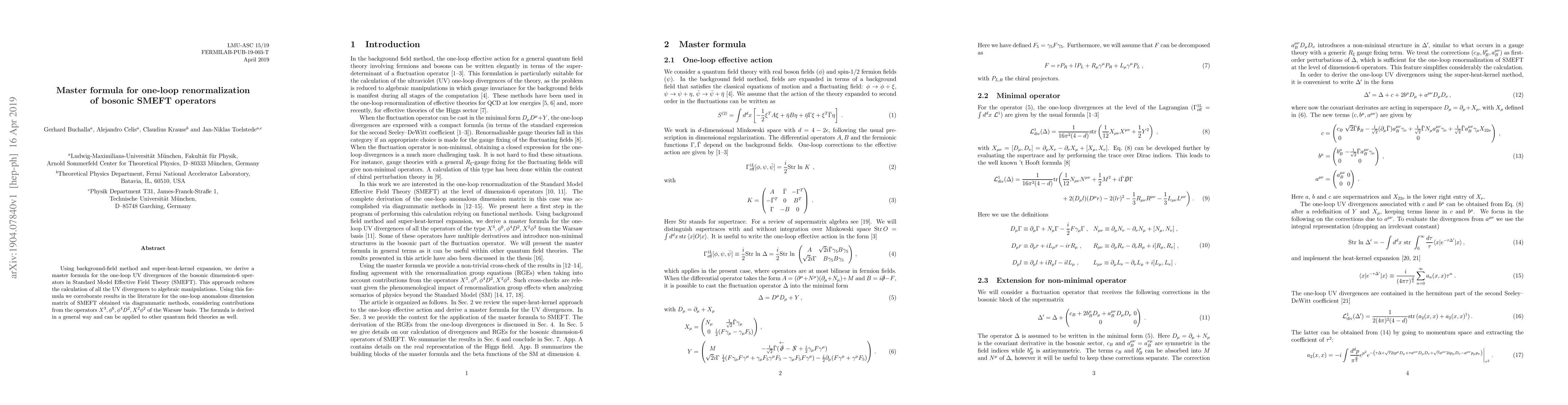 This paper derives a master formula for the one-loop ultraviolet divergences of bosonic dimension-6 operators in Standard Model Effective Field Theory (SMEFT) using the background-field method and super-heat-kernel expansion, simplifying calculations to algebraic manipulations. The derived formula is verified against existing literature results for specific SMEFT operators.