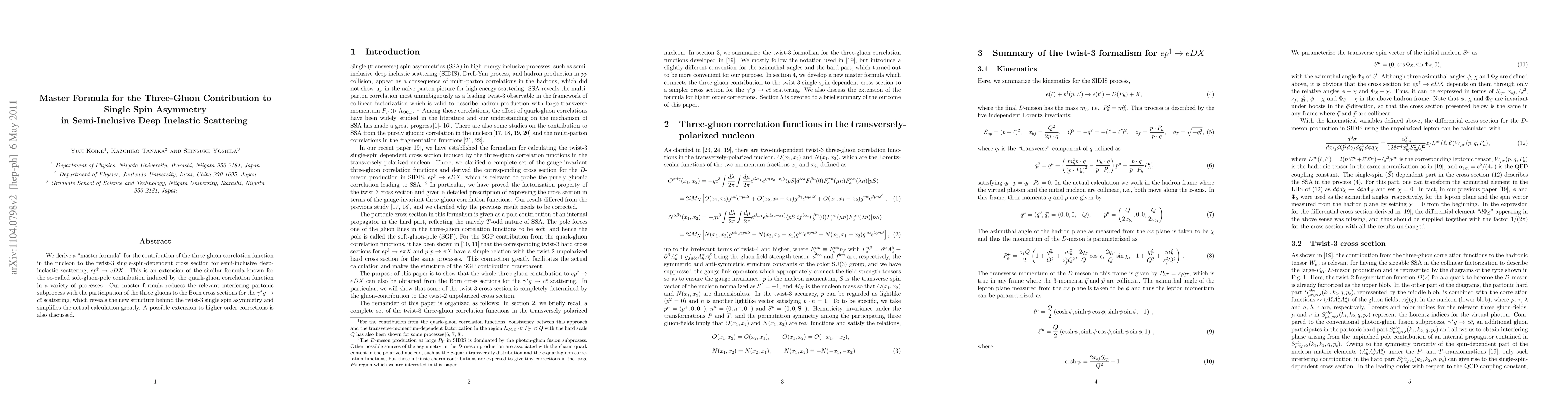 This paper derives a "master formula" for the three-gluon contribution to the twist-3 single-spin asymmetry in semi-inclusive deep inelastic scattering, simplifying the calculation by relating it to Born cross sections for \gamma^*g\to c\bar{c} scattering. The formula extends previous results for soft-gluon-pole contributions and discusses potential higher-order corrections.