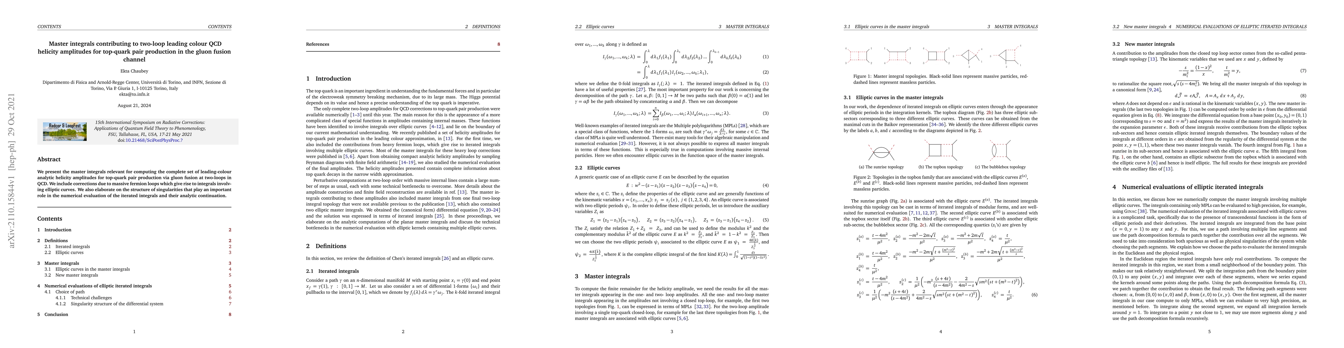 We present the master integrals relevant for computing the complete set of leading-colour analytic helicity amplitudes for top-quark pair production via gluon fusion at two-loops in QCD. We include corrections due to massive fermion loops which give rise to integrals involving elliptic curves. We also elaborate on the structure of singularities that play an important role in the numerical evaluation of the iterated integrals and their analytic continuation.