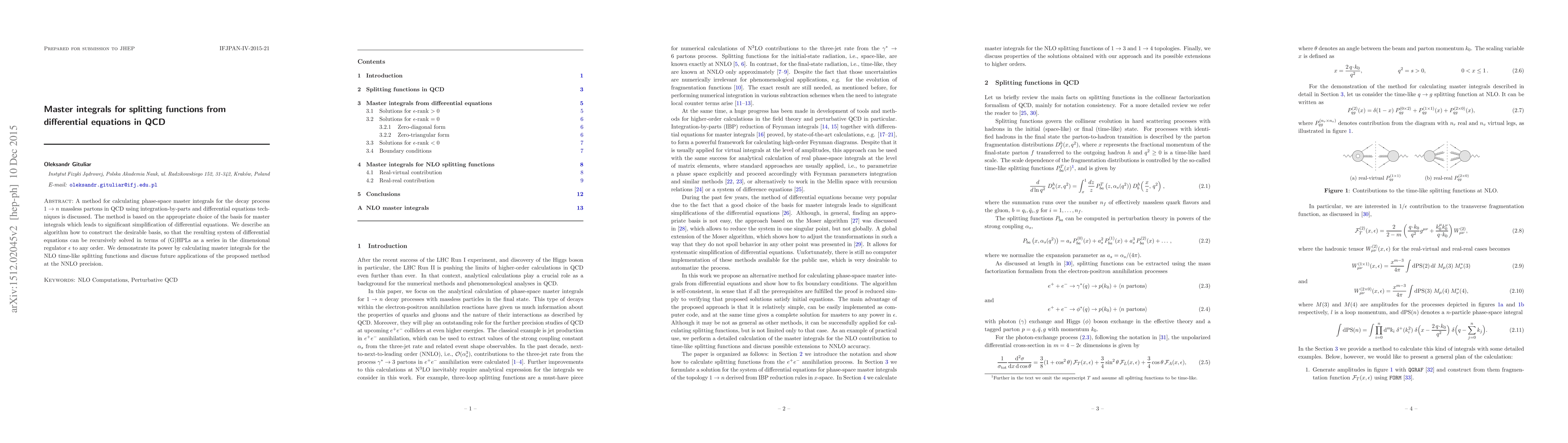This paper presents a method for calculating master integrals in QCD decay processes using integration-by-parts and differential equations. The proposed algorithm simplifies the system of differential equations, allowing for recursive solutions in terms of generalized hypergeometric functions, demonstrated through the calculation of next-to-leading order splitting functions.