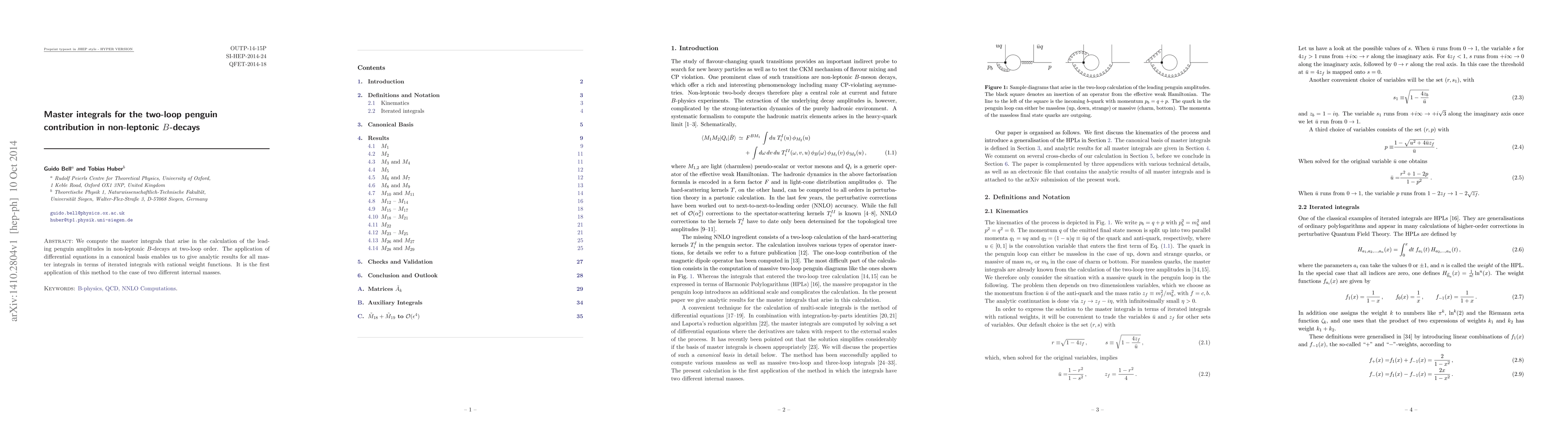 This paper computes the master integrals for two-loop penguin contributions in non-leptonic B-decays, employing differential equations to provide analytic results in terms of iterated integrals. This is the first application of this method to scenarios with two distinct internal masses.