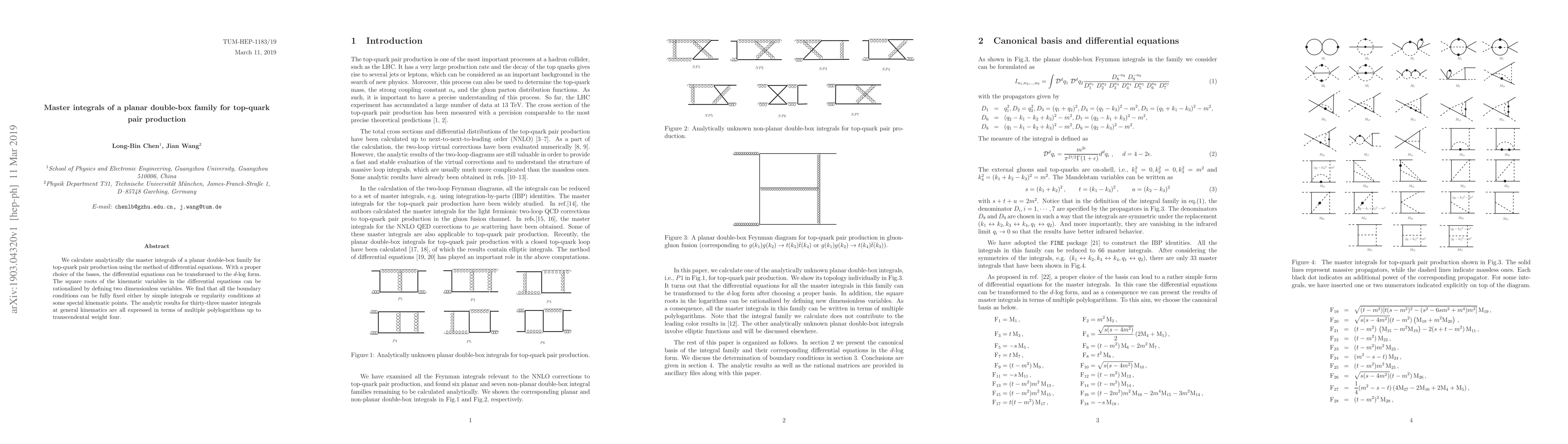 This paper analytically computes the master integrals of a planar double-box family for top-quark pair production using differential equations. The results are expressed in terms of multiple polylogarithms, with all boundary conditions fixed by simple integrals or regularity conditions.