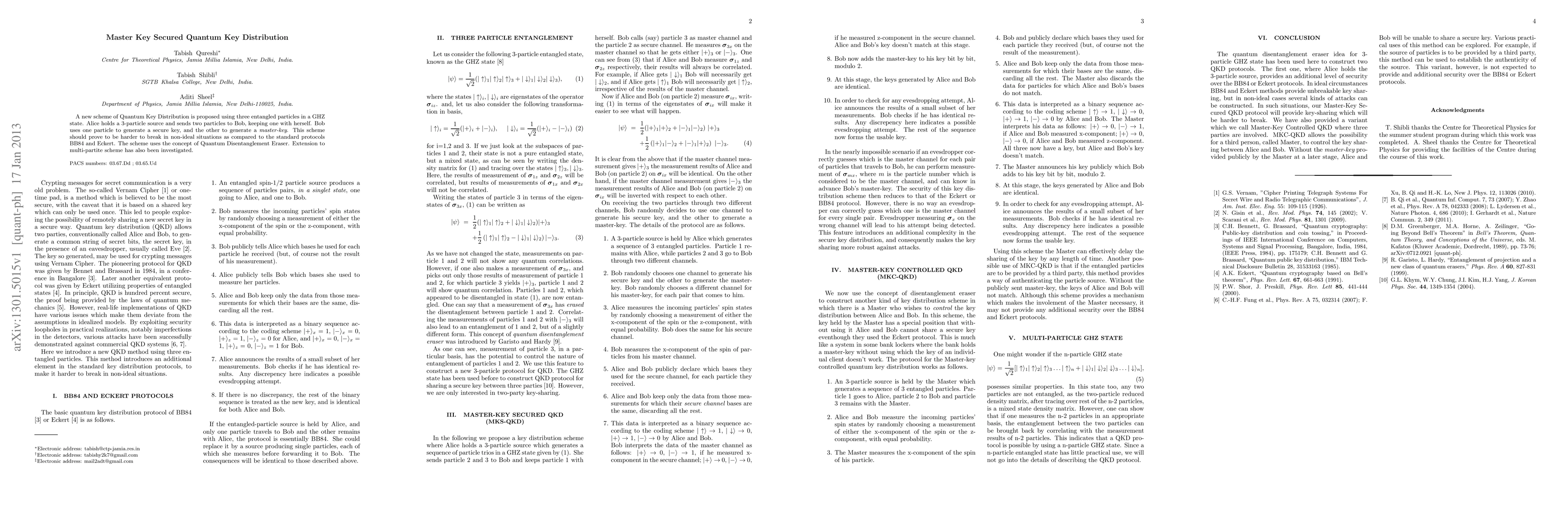 Summary: This paper proposes a novel Quantum Key Distribution scheme using three-particle GHZ entangled states, where Alice and Bob share secure keys through the generation of a master-key, leveraging Quantum Disentanglement Eraser for enhanced security over standard protocols like BB84 and Eckert. The study also explores its extension to multi-partite systems.
