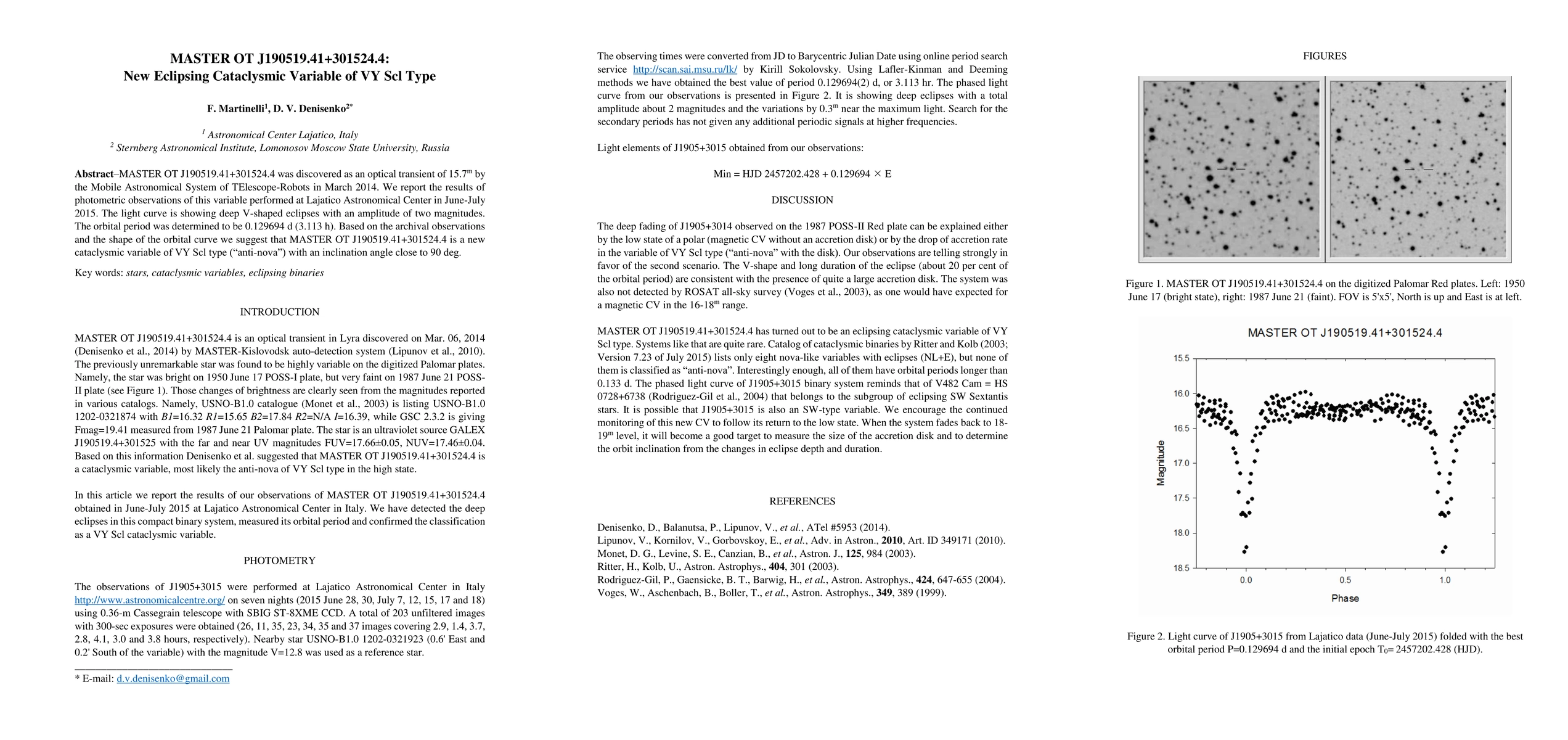 The paper reports the discovery of a new eclipsing cataclysmic variable, MASTER OT J190519.41+301524.4, of VY Scl type, found through photometric observations at Lajatico Astronomical Center. The orbital period is determined to be approximately 3.113 hours with deep V-shaped eclipses of two magnitudes, suggesting an inclination angle close to 90 degrees.
