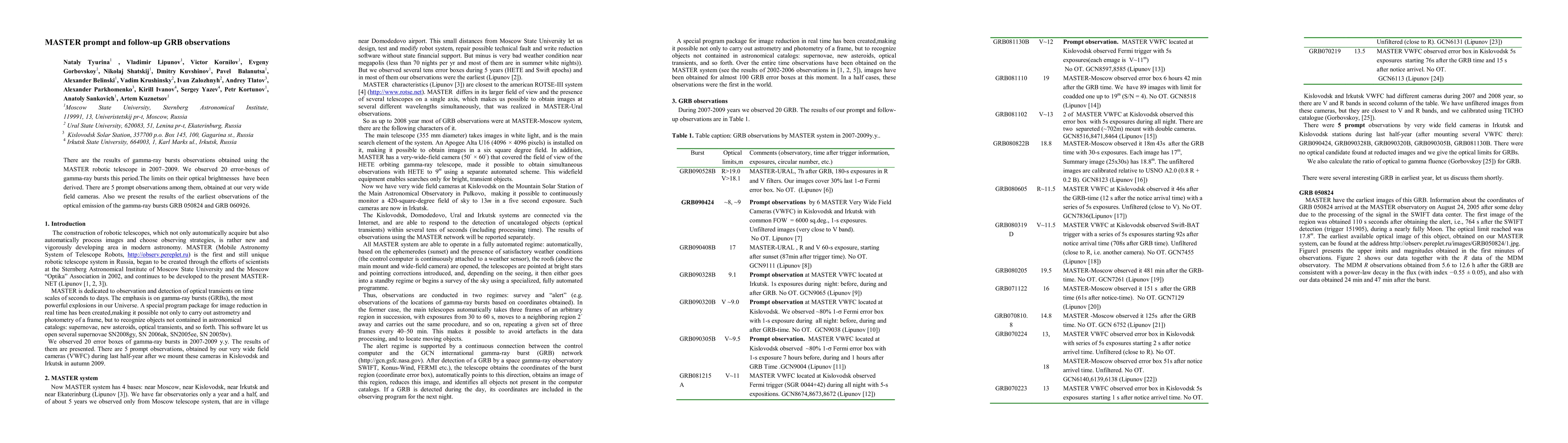 There are the results of gamma-ray bursts observations obtained using the MASTER robotic telescope in 2007 - 2009. We observed 20 error-boxes of gamma-ray bursts this period.The limits on their optical brightnesses have been derived. There are 5 prompt observations among them, obtained at our very wide field cameras. Also we present the results of the earliest observations of the optical emission of the gamma-ray bursts GRB 050824 and GRB 060926.
