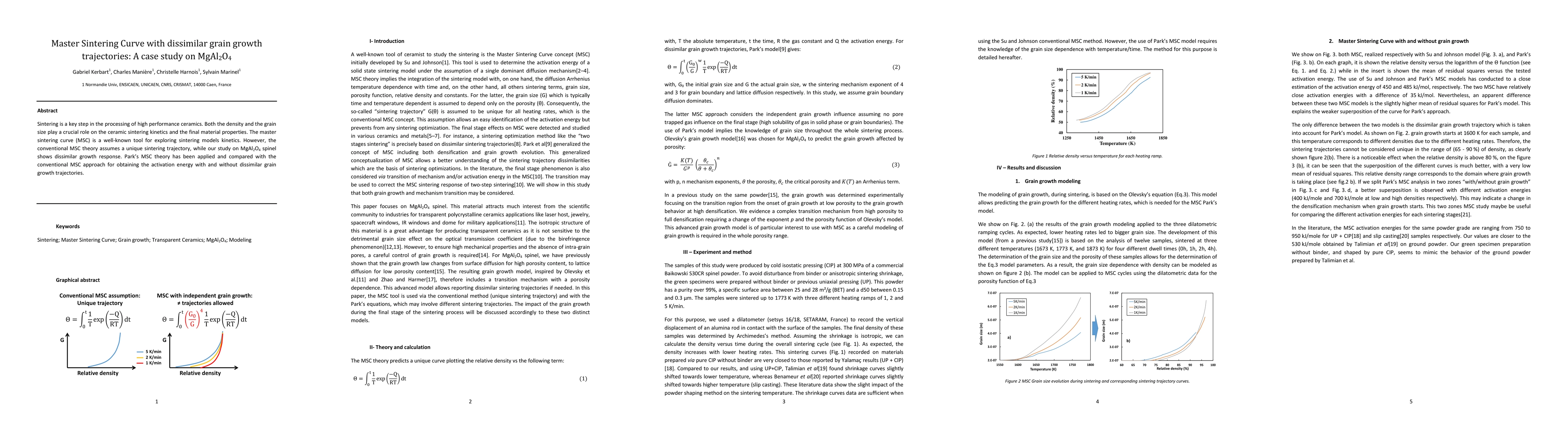This study examines the sintering kinetics of MgAl2O4 spinel, demonstrating that it follows dissimilar grain growth trajectories compared to conventional assumptions. The research applies Park's master sintering curve theory to compare activation energy results with and without accounting for these dissimilar grain growth patterns.