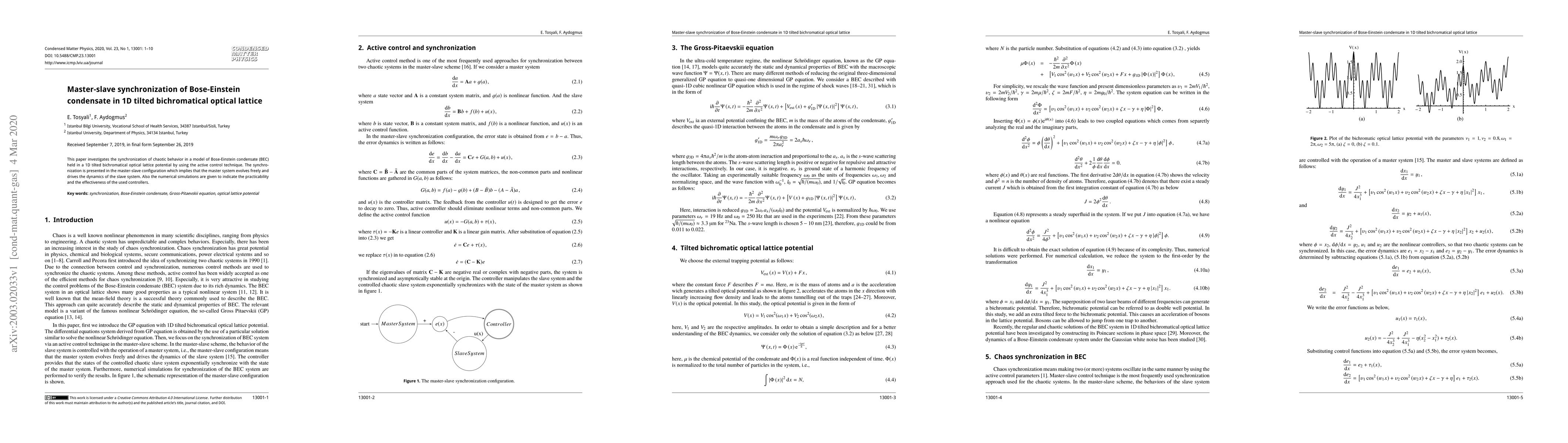 This paper explores the synchronization of chaotic behavior in a 1D tilted bichromatical optical lattice using active control techniques in a Bose-Einstein condensate, demonstrating a master-slave configuration where the master system drives the slave system. Numerical simulations validate the effectiveness of the proposed control methods.