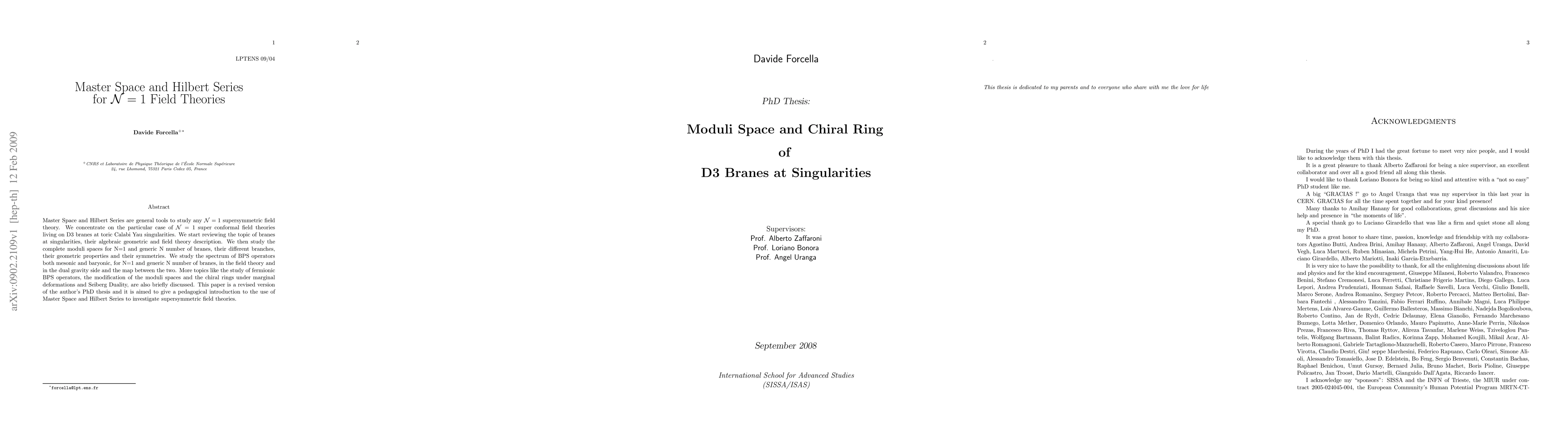 This paper provides a comprehensive introduction to using Master Space and Hilbert Series to study N=1 supersymmetric field theories, with a focus on N=1 superconformal field theories on D3 branes at toric Calabi Yau singularities. It discusses moduli spaces, BPS operator spectra, and the impact of marginal deformations and Seiberg Duality.