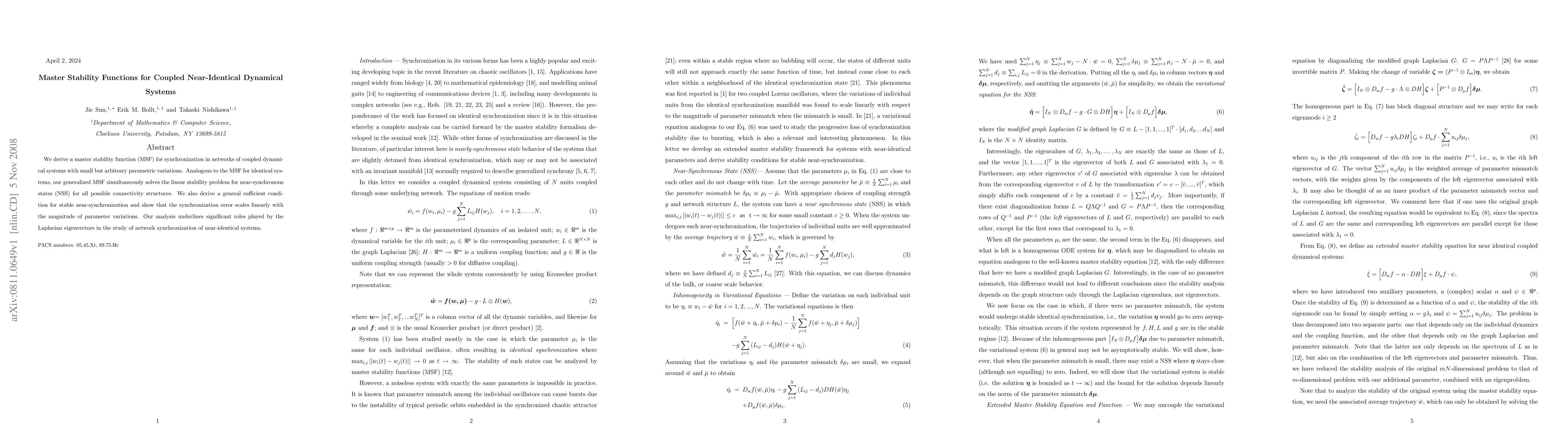 This paper derives a master stability function for synchronization in networks of coupled near-identical dynamical systems, providing a generalized approach that accounts for small parametric variations. It establishes a sufficient condition for stable near-synchronization and highlights the importance of Laplacian eigenvectors in network synchronization analysis.