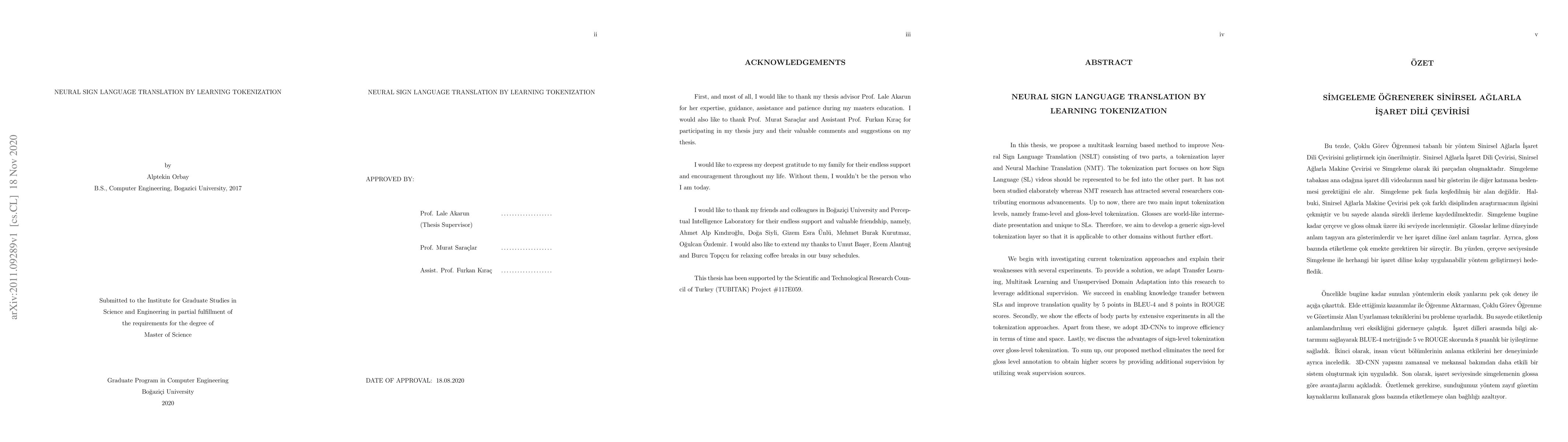 This thesis proposes a multitask learning method for Neural Sign Language Translation (NSLT) that includes a novel sign-level tokenization layer and Neural Machine Translation (NMT). The research aims to improve translation quality by leveraging transfer learning, multitask learning, and unsupervised domain adaptation, achieving a 5-point improvement in BLEU-4 and an 8-point improvement in ROUGE scores. The study also highlights the efficiency benefits of using 3D-CNNs and discusses the advantages of sign-level over gloss-level tokenization.