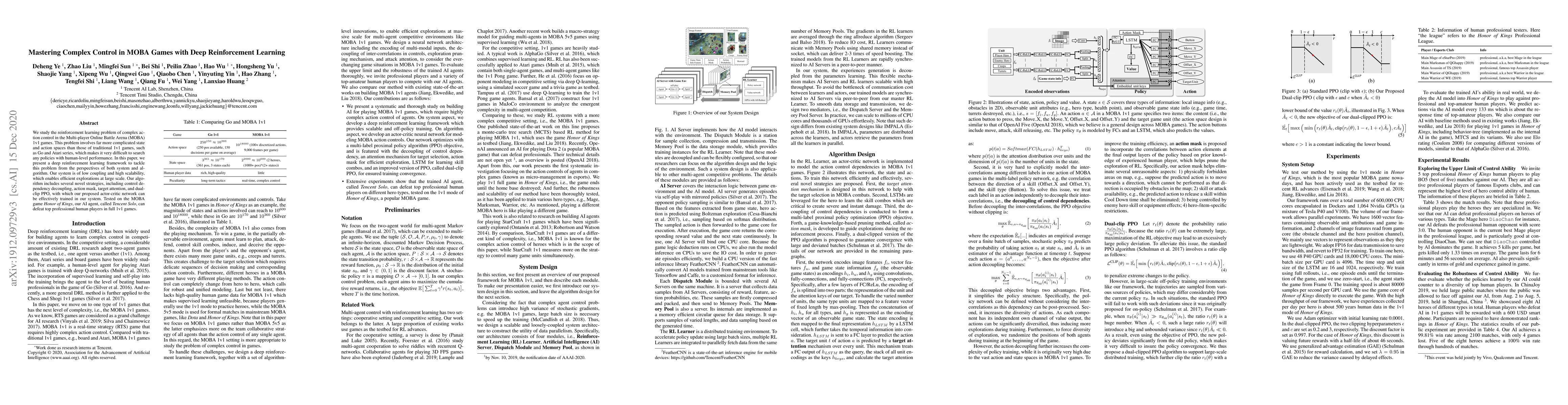 This research develops a deep reinforcement learning framework to master complex action control in MOBA 1v1 games, introducing novel strategies like control dependency decoupling and dual-clip PPO. The AI agent, Tencent Solo, successfully defeats top human players in the game Honor of Kings.