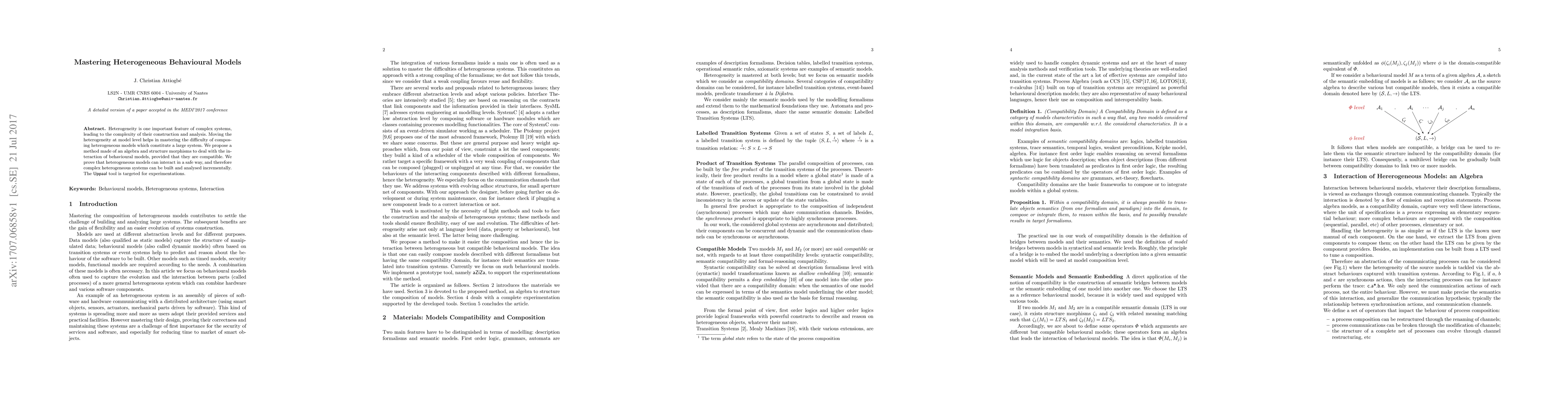 This paper proposes an algebra and structure morphisms method to manage the interaction of compatible heterogeneous behavioural models, ensuring safe incremental composition and analysis of complex systems, with Uppaal as the experimentation tool.