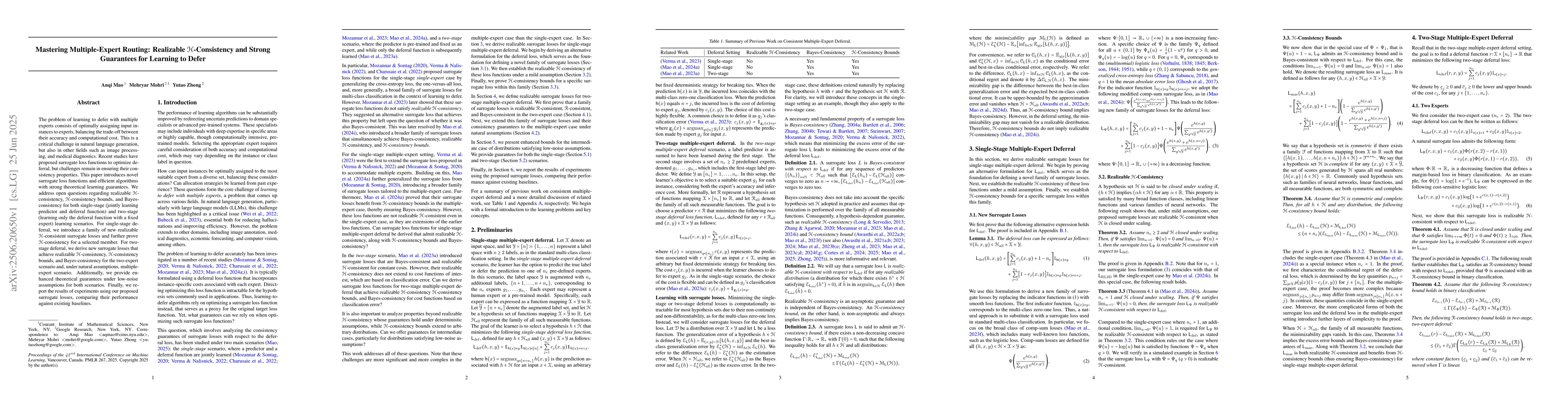 The problem of learning to defer with multiple experts consists of optimally assigning input instances to experts, balancing the trade-off between their accuracy and computational cost. This is a critical challenge in natural language generation, but also in other fields such as image processing, and medical diagnostics. Recent studies have proposed surrogate loss functions to optimize deferral, but challenges remain in ensuring their consistency properties. This paper introduces novel surrogate loss functions and efficient algorithms with strong theoretical learning guarantees. We address open questions regarding realizable $H$-consistency, $H$-consistency bounds, and Bayes-consistency for both single-stage (jointly learning predictor and deferral function) and two-stage (learning only the deferral function with a fixed expert) learning scenarios. For single-stage deferral, we introduce a family of new realizable $H$-consistent surrogate losses and further prove $H$-consistency for a selected member. For two-stage deferral, we derive new surrogate losses that achieve realizable $H$-consistency, $H$-consistency bounds, and Bayes-consistency for the two-expert scenario and, under natural assumptions, multiple-expert scenario. Additionally, we provide enhanced theoretical guarantees under low-noise assumptions for both scenarios. Finally, we report the results of experiments using our proposed surrogate losses, comparing their performance against existing baselines.