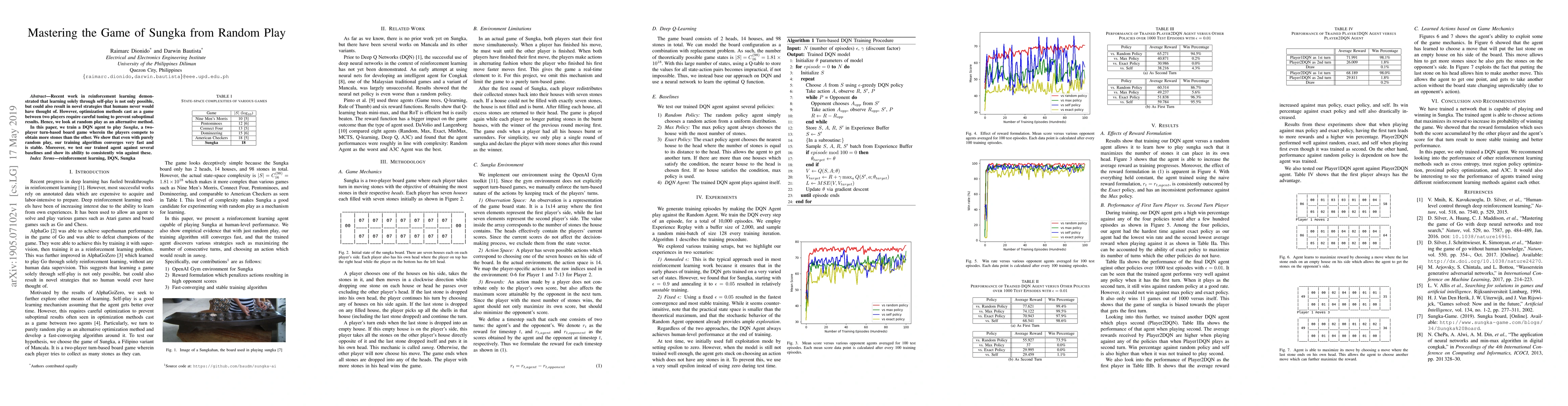 Recent work in reinforcement learning demonstrated that learning solely through self-play is not only possible, but could also result in novel strategies that humans never would have thought of. However, optimization methods cast as a game between two players require careful tuning to prevent suboptimal results. Hence, we look at random play as an alternative method. In this paper, we train a DQN agent to play Sungka, a two-player turn-based board game wherein the players compete to obtain more stones than the other. We show that even with purely random play, our training algorithm converges very fast and is stable. Moreover, we test our trained agent against several baselines and show its ability to consistently win against these.