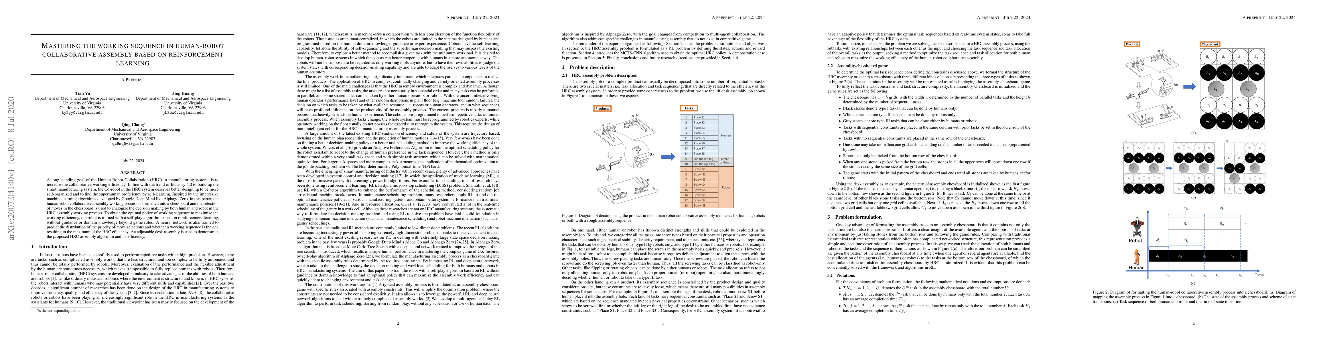 This paper explores optimizing human-robot collaborative assembly efficiency using reinforcement learning, modeling the assembly process as a chess game to train a robot via self-play. The robot learns optimal working sequences without external guidance, demonstrating improved efficiency in an adjustable desk assembly.