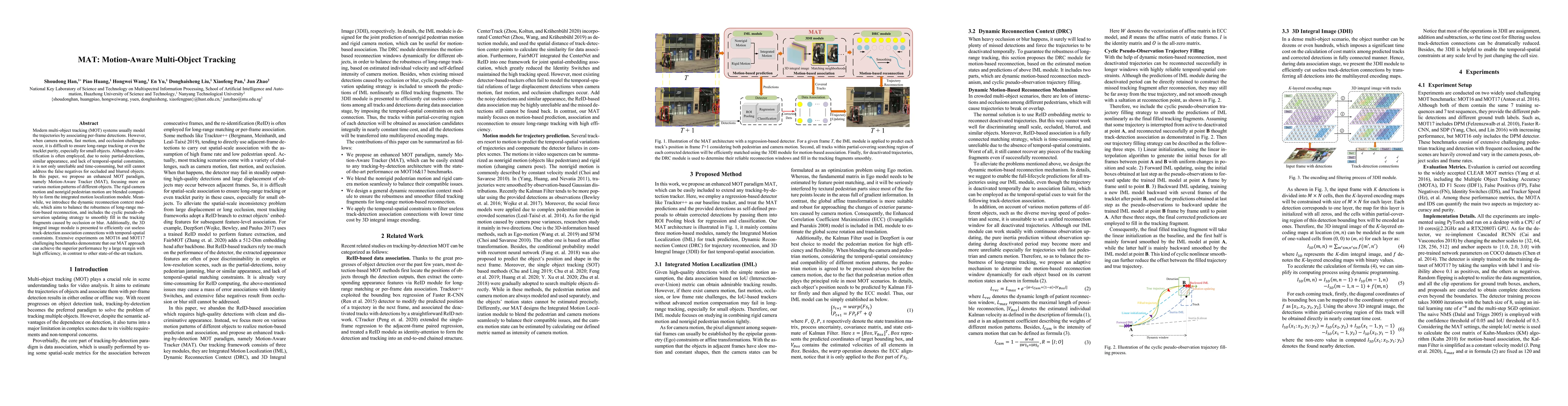 The paper proposes the Motion-Aware Tracker (MAT) to enhance multi-object tracking by integrating motion localization and dynamic reconnection modules, achieving superior performance on MOT16 and MOT17 benchmarks. MAT effectively handles camera and pedestrian motion, occlusion, and blur, outperforming other state-of-the-art methods.