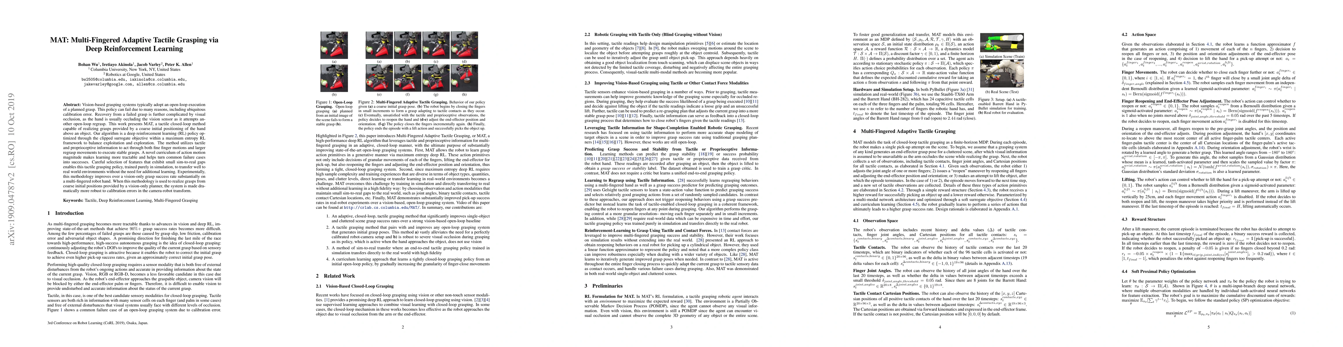 The paper presents MAT, a deep reinforcement learning policy for multi-fingered adaptive tactile grasping, utilizing tactile and proprioceptive information for fine finger motions and larger regrasp movements. The method employs a curriculum of action motion magnitude and carefully selected features to ensure effective sim-to-real transfer.