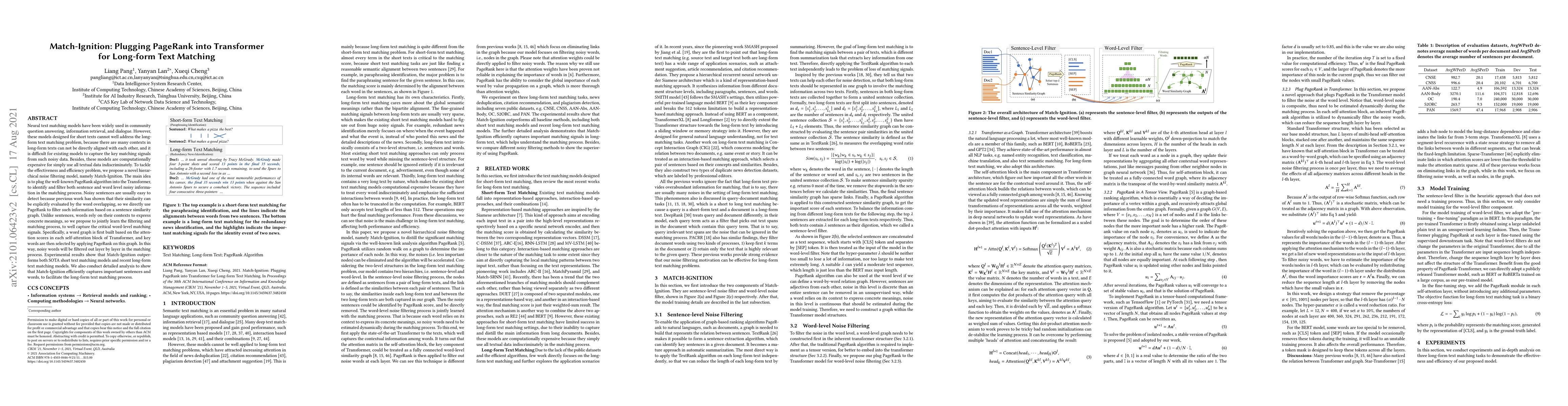 Neural text matching models have been widely used in community question answering, information retrieval, and dialogue. However, these models designed for short texts cannot well address the long-form text matching problem, because there are many contexts in long-form texts can not be directly aligned with each other, and it is difficult for existing models to capture the key matching signals from such noisy data. Besides, these models are computationally expensive for simply use all textual data indiscriminately. To tackle the effectiveness and efficiency problem, we propose a novel hierarchical noise filtering model, namely Match-Ignition. The main idea is to plug the well-known PageRank algorithm into the Transformer, to identify and filter both sentence and word level noisy information in the matching process. Noisy sentences are usually easy to detect because previous work has shown that their similarity can be explicitly evaluated by the word overlapping, so we directly use PageRank to filter such information based on a sentence similarity graph. Unlike sentences, words rely on their contexts to express concrete meanings, so we propose to jointly learn the filtering and matching process, to well capture the critical word-level matching signals. Specifically, a word graph is first built based on the attention scores in each self-attention block of Transformer, and key words are then selected by applying PageRank on this graph. In this way, noisy words will be filtered out layer by layer in the matching process. Experimental results show that Match-Ignition outperforms both SOTA short text matching models and recent long-form text matching models. We also conduct detailed analysis to show that Match-Ignition efficiently captures important sentences and words, to facilitate the long-form text matching process.