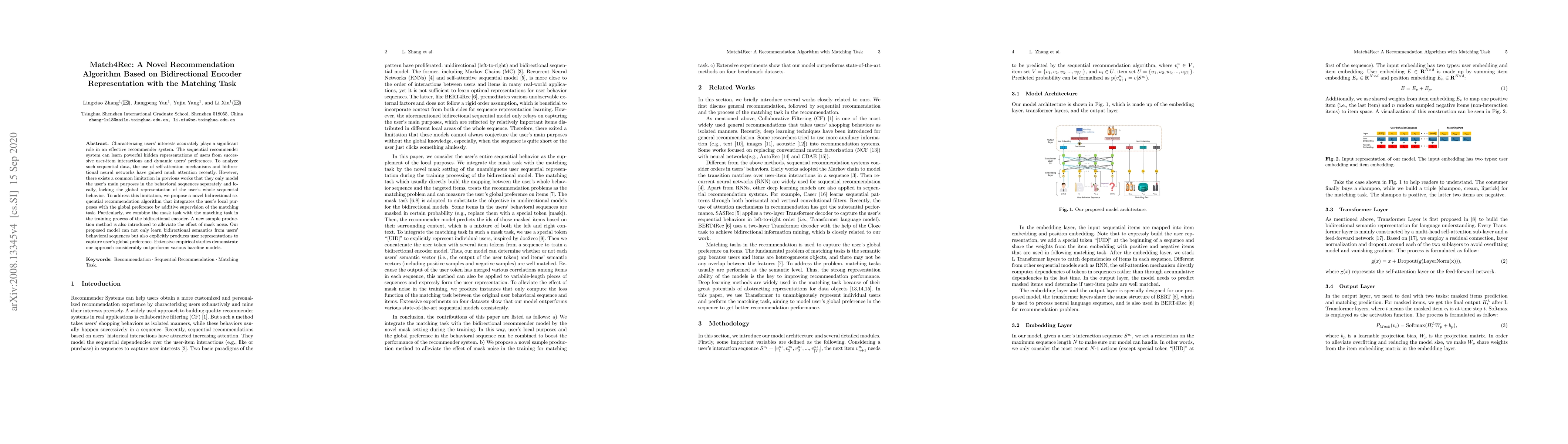 The Match4Rec algorithm proposes a novel bidirectional recommendation method that integrates local and global user preferences through additive supervision of matching tasks, significantly outperforming existing models in empirical studies. It combines mask and matching tasks in a bidirectional encoder to enhance user representation and sequential behavior analysis.