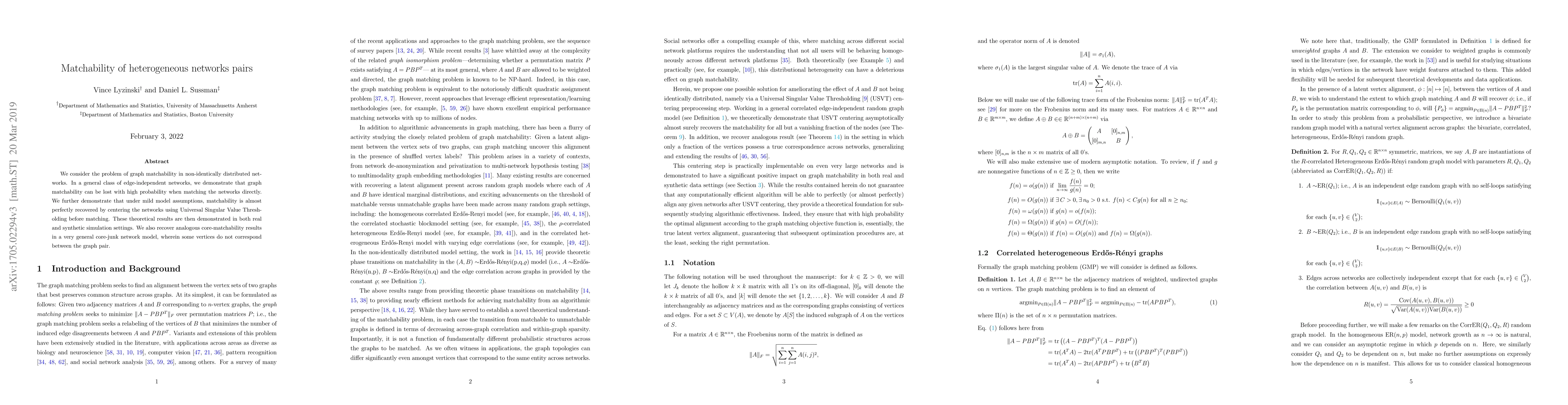 This paper investigates graph matchability in non-identically distributed networks, showing that direct matching often fails but can be almost perfectly recovered by centering networks using Universal Singular Value Thresholding. Theoretical results are validated through both real and synthetic simulations, and analogous findings are obtained in a core-junk network model.
